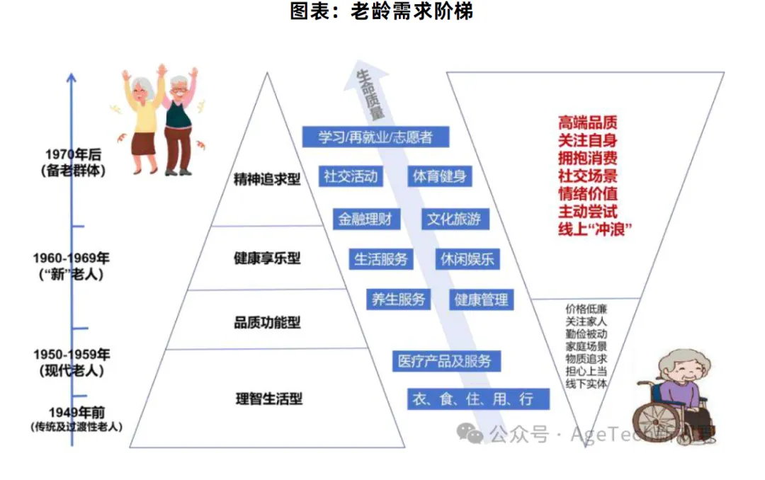 1.年轻老人(60-69 岁):身体状况好,重社交、爱文娱,追求健康与精神生活。2.中年老人(70-79 岁):慢病高发,需要生活照料 + 医疗护理双重支持。3.高龄老人(80 岁以上):失能失智比例高,依赖专业护理、康复、安宁疗护。