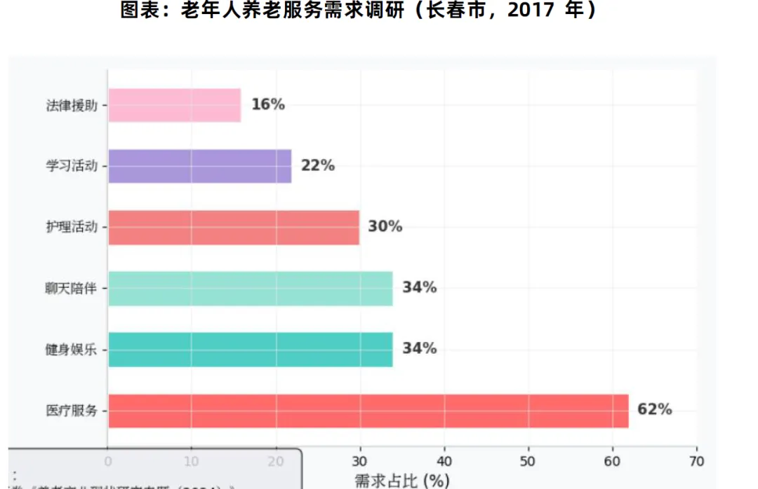 2. 医疗护理与康复:慢病管理、上门巡诊、术后康复、紧急救助,需求占比最高。