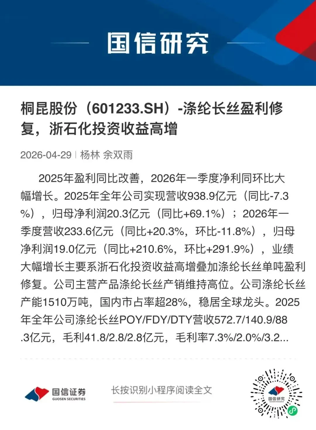 【桐昆股份 | 2024年一季报点评:一季度净利扭亏为盈,长丝盈利修复中】-国信证券