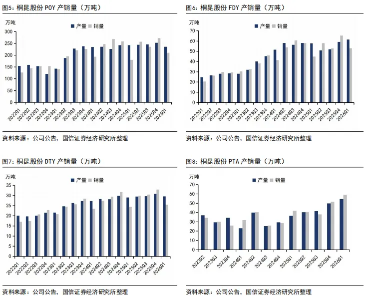 公司主营产品涤纶长丝产销维持高位。公司涤纶长丝产能1510万吨,国内市占率超28%,稳居全球龙头。2025年全年公司涤纶长丝POY/FDY/DTY营收572.7/140.9/88.3亿元,毛利41.8/2.8/2.8亿元,毛利率7.3%/2.0%/3.2%(同比+2.9/-6.2/-0.4pct)。2025年公司涤纶长丝销量1288万吨(同比-1%),2026年一季度销量289万吨(同比+16%);PTA销量59万吨(同比+40%,环比+14%),一季度下游企业补库需求释放,叠加行业开工率维持高位,产销表现稳健。