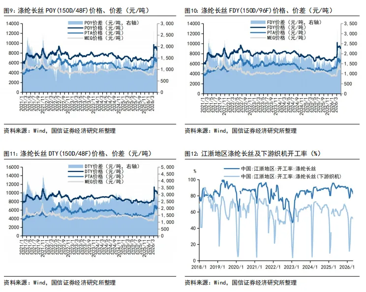 2025年全年公司POY/FDY/DTY不含税售价为6052/6371/7492元/吨(同比-9%/-14%/-10%),主要原材料PX/PTA/MEG不含税采购价为6034/4215/3856元/吨(同比-14%/-15%/-5%),成本降幅大于产品降幅,支撑毛利率同比提升。2026年一季度地缘冲突导致国际油价大幅上行,涤纶长丝上游原料端成本压力显著传导,石脑油、PX(对二甲苯)、PTA(精对苯二甲酸)等核心原料价格同步攀升,POY/FDY/DTY售价大幅抬升;同时一季度MEG价格同比回落约17%,涤纶长丝与原料价差环比扩大,价差修复至近年较好水平,单吨盈利改善明显。2025年涤纶长丝行业产能增速放缓至4.1%,开工率84.73%创历史新高,直纺产能集中度持续提升;需求端,全年涤纶长丝出口同比增长10.62%,外需韧性支撑行业景气修复。