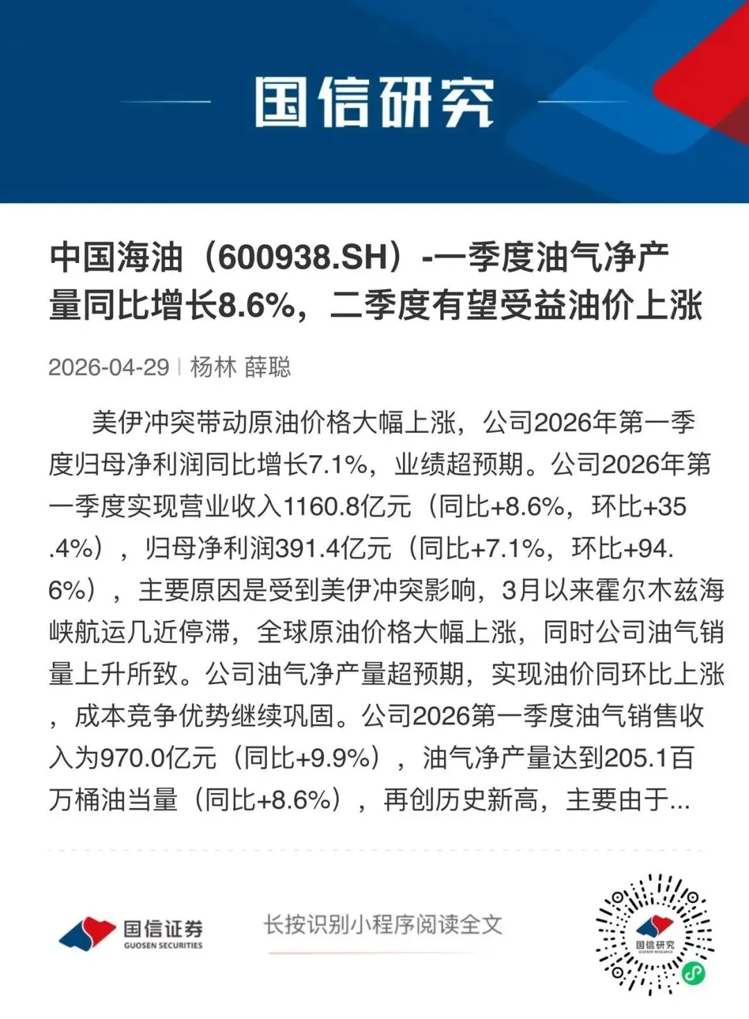 美伊冲突带动原油价格大幅上涨,公司2026年第一季度归母净利润同比增长7.1%,业绩超预期