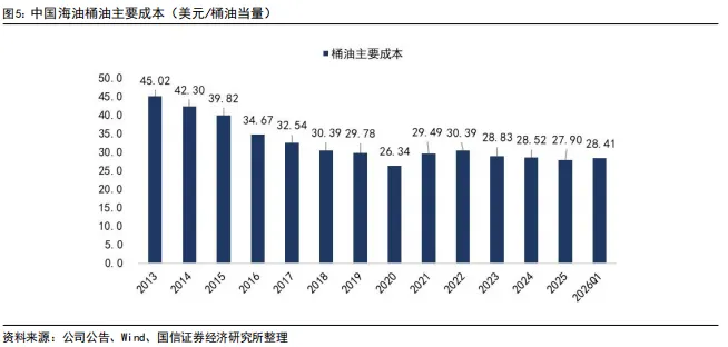 2026年第一季度布伦特原油均价78.4美元/桶(同比+4.5%),公司实现价格75.9美元/桶(同比+4.5%),与布伦特原油均价贴水2.5美元/桶(同比扩大0.1美元/桶),平均实现气价为7.69美元/千立方英尺(同比-1.2%)。公司2026年第一季度桶油主要成本28.4美元/桶油当量(同比+1.4美元/桶油当量),主要受到人民币升值及税金上涨的影响,作业费用为6.66美元/桶油当量(同比基本持平),桶油作业费用管控良好,保持成本竞争优势。