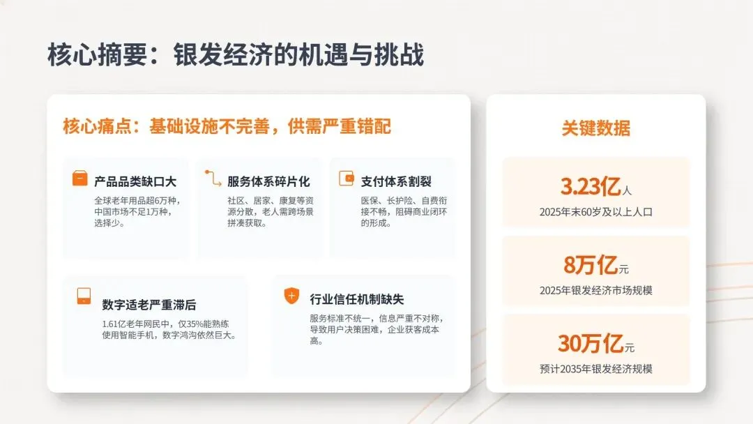 我们之前说过,2026年是“十五五”开局之年,也是银发经济跨越性发展的关键一年。随着我国人口老龄化程度持续加深,最新数据显示全国65岁以上的老人已经首次超过0-14岁的少儿群体,银发经济也已从补充性市场升级为国家内需增长的核心引擎。当前其发展的核心堵点并非老年群体消费能力不足,而是供需结构性错配——有效供给与真实需求的精准匹配度严重不足。