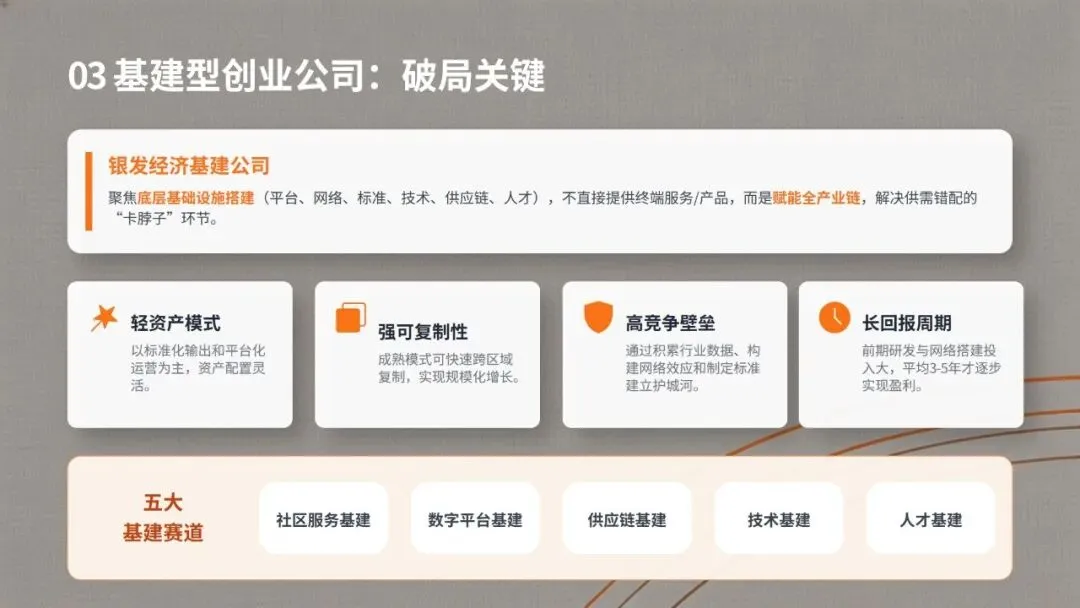 银发创投部落认为从产业发展底层逻辑判断,基建化程度的全面提升,将是破解银发经济供需错配的关键抓手。