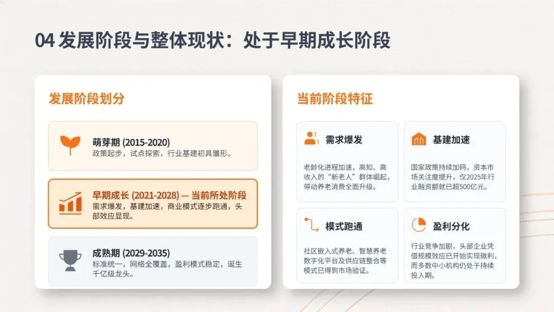 2、质量升级期:产业逻辑从“规模扩张”转向“质量适配”。过去企业只要布局养老服务就能获得政策红利的粗放发展模式已然结束,政策与市场都在倒逼行业进行供给侧改革。行业共识的高质量供给方向已基本明确:围绕不同年龄、不同健康状况、不同收入层次的老人群体分层适配——针对低龄活力老人重点开发旅居、文娱类标准化产品;针对高龄失能老人聚焦康复护理、居家改造等刚需服务,成为产业发展的核心方向。