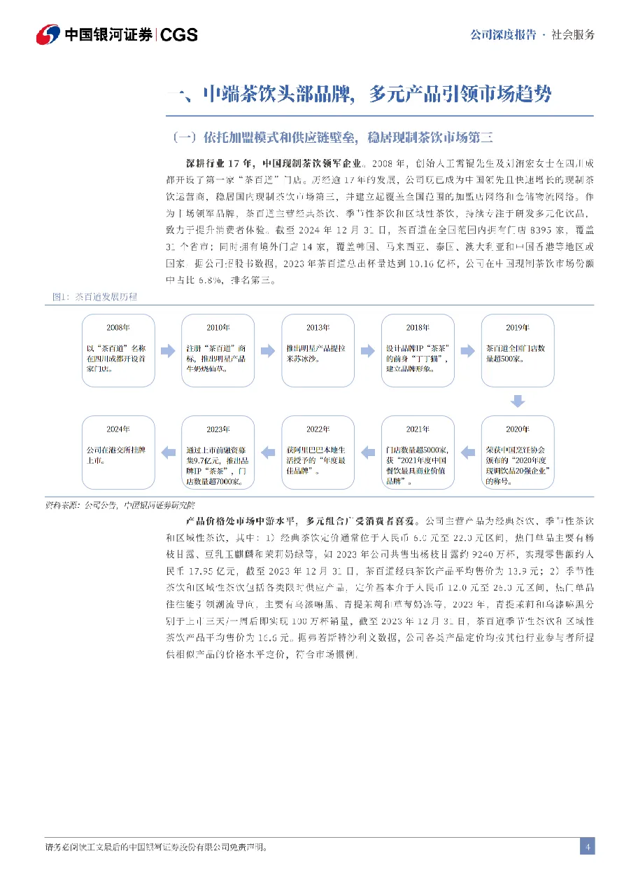 • 下沉市场扩张提速,CAGR接近50%:2020-2024年,茶百道在三线及以下城市门店CAGR达49.4%,但当前占比仅44.9%,仍低于蜜雪冰城(57.4%),下沉空间广阔。三线及以下城市现制茶饮市场规模2023-2028E CAGR预计达22.8%,为行业增长主引擎。