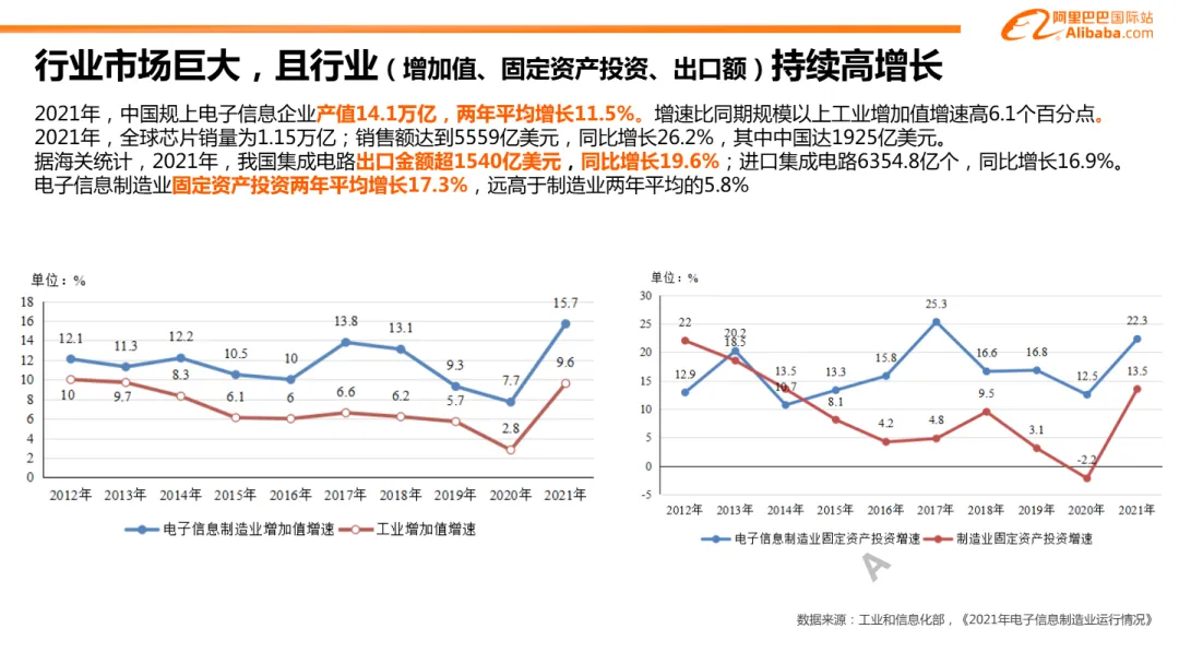 • PCB、传感器、开发板为国际站高增长品类:近90天日均活跃买家数同比分别增长23.32%、34.29%、121.47%,尤其是HDI板、柔性板、封装基板在5G、智能穿戴等领域需求旺盛;IoT推动传感器市场快速增长,2021年中国规模已达2951.8亿元,增速17.6%。