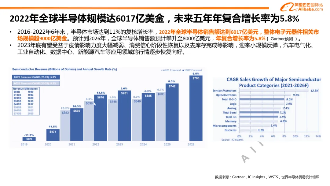 • 全球半导体市场将持续高增长:2022年全球半导体销售额达6017亿美元,预计2026年将攀升至8000亿美元,年复合增长率5.8%(Gartner预测),其中汽车电子、工业控制、新能源储能成为核心驱动力。