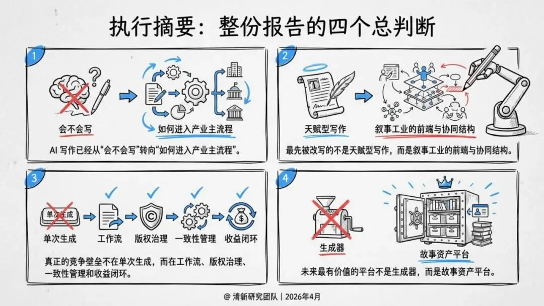 整体来看,AI 写作正从工具竞争升级为生产链与生态系统竞争,人机协同的工业化叙事生产模式将成为行业主流。