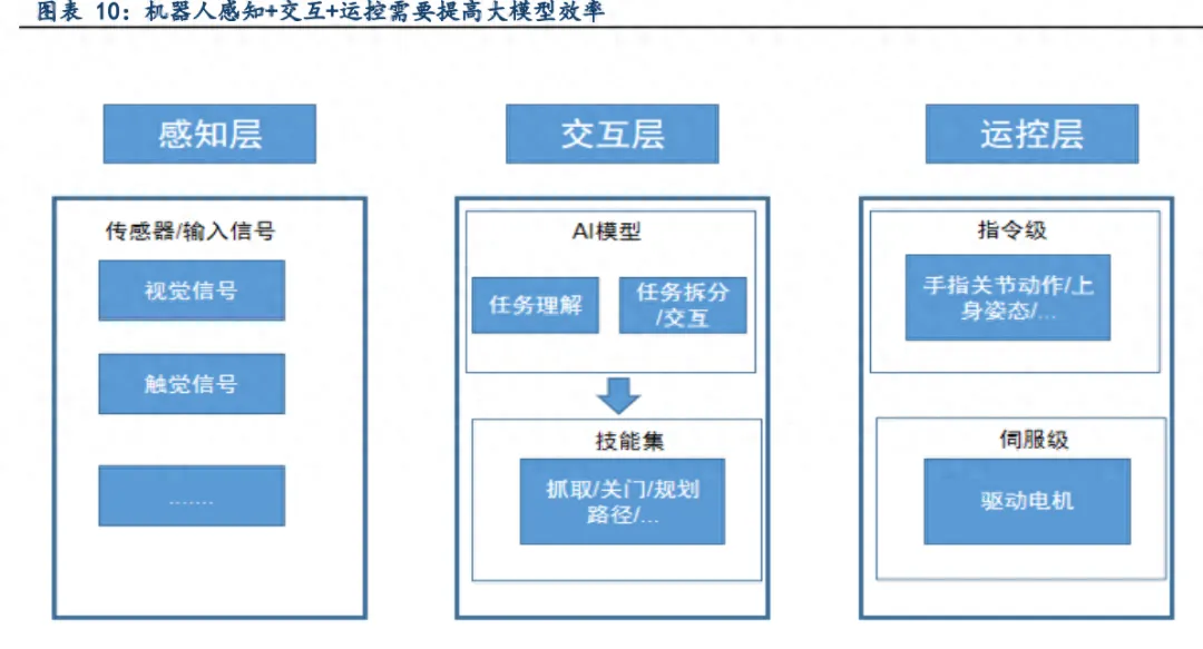 任务级交互+时效性是机器人控制难点。一般而言,机器人在执行任务的时候,需要通过传感器去感知周边环境情况,收集图像、语音信息,之后通过自身处理器和 AI 大模型去理解任务,再将任务拆分成可以执行的步骤。机器人本身通过机器训练等具有一定技能集合,这些可执行 步骤经由机器人具体执行,转换为各个部件传统运控系统可执行的信号。但这些任务级交互需要较高的 AI 大模型决策能力和理解能力;同时,对任务拆解-运控规划的时效性也具有一定要求,需要机器人与环境交互时更快、更精确地执行任务,这意味着大模型效率需要进一步提升。