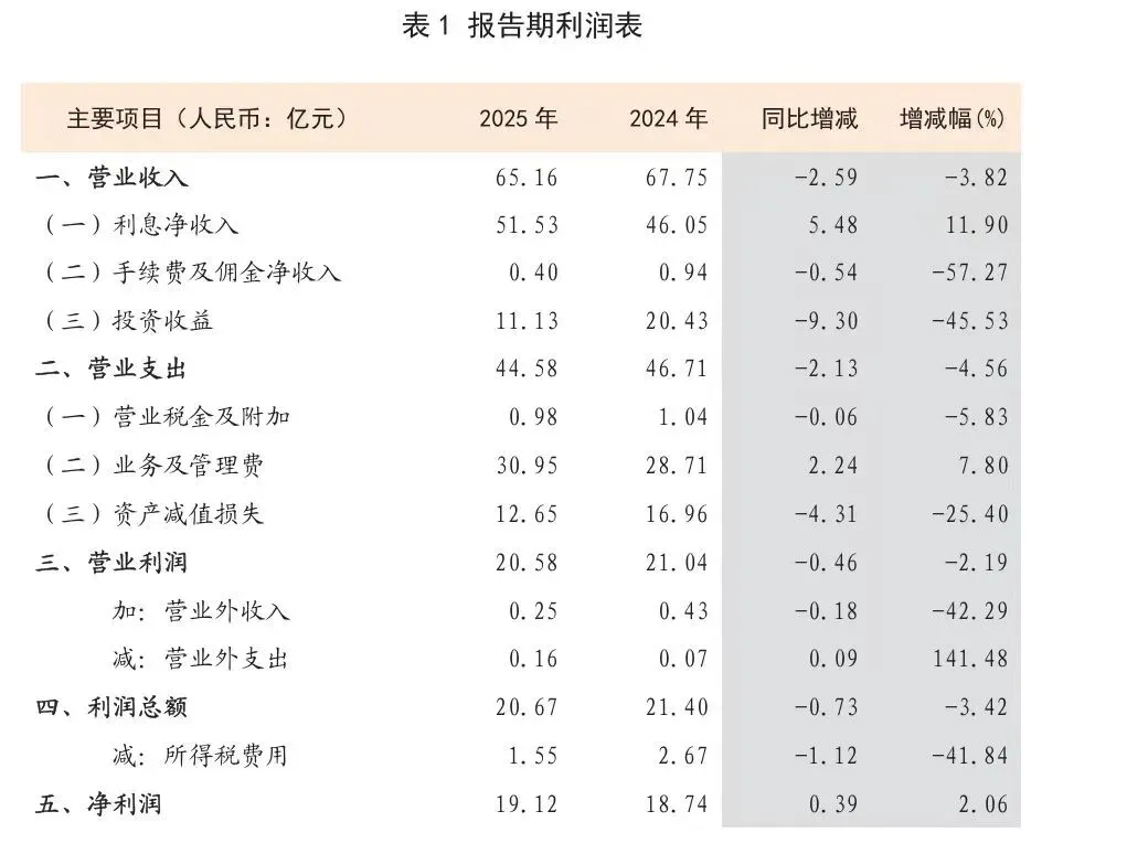 2025年,秦农银行经营呈现“量稳质升、降本增效”特征,具体来看,全年实现营业收入65.16亿元,同比下降3.82%;归母净利润19.12亿元,同比增长2.06%,在行业营收普遍承压的背景下,实现净利润正增长。