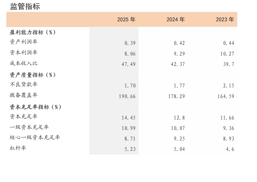 年报显示,秦农银行持续夯实资产质量底盘,2025年末,不良贷款率为1.70%,较上年末略有波动,但低于长安银行2024年末的1.83%,略高于西安银行的1.65%。拨备覆盖率维持在190%以上,风险抵补能力充足,为后续经营筑牢安全垫。