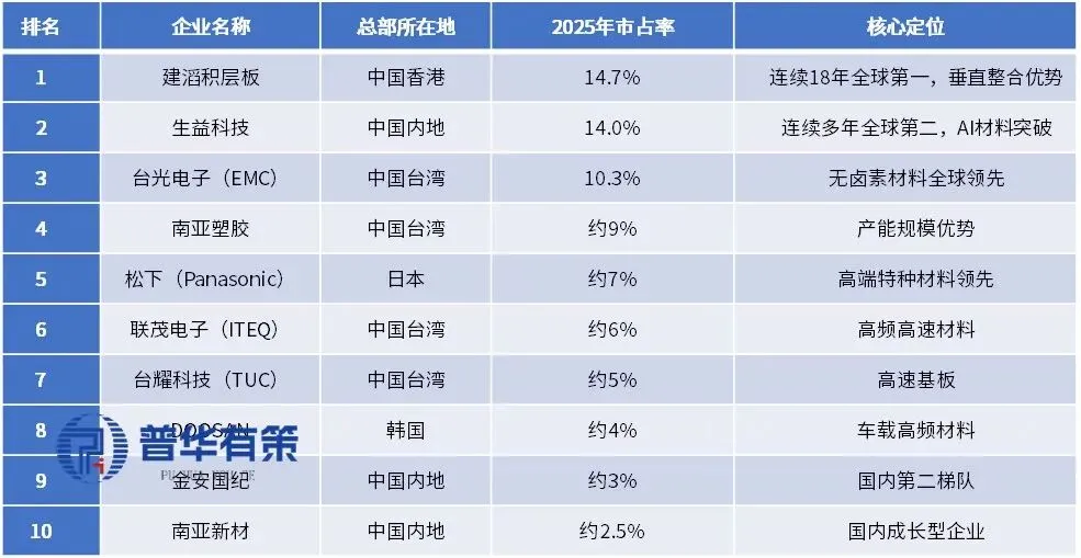 覆铜板作为电子信息产业的基础材料,有较高的技术、资金和市场壁垒,目前已形成较为集中的市场格局,2025年全球刚性覆铜板行业前10名厂商合计市占率预计保持在77%-79%区间,与2024年的77.20%基本持平,行业高度集中的“巨头主导”格局延续