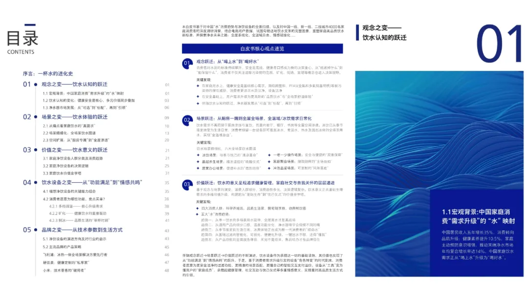 这份白皮书,基于对中国“水”消费趋势与净饮设备的全景扫描,以及对4000名家庭消费者的深度调研,从观念、场景、价值、设备、品牌等维度,系统阐述了中国家庭饮水消费的三大跃迁:从“喝上水”到“喝好水”的品质升级,从厨房一隅到全屋全场景的空间延伸,从功能工具到生活方式载体的价值升维。