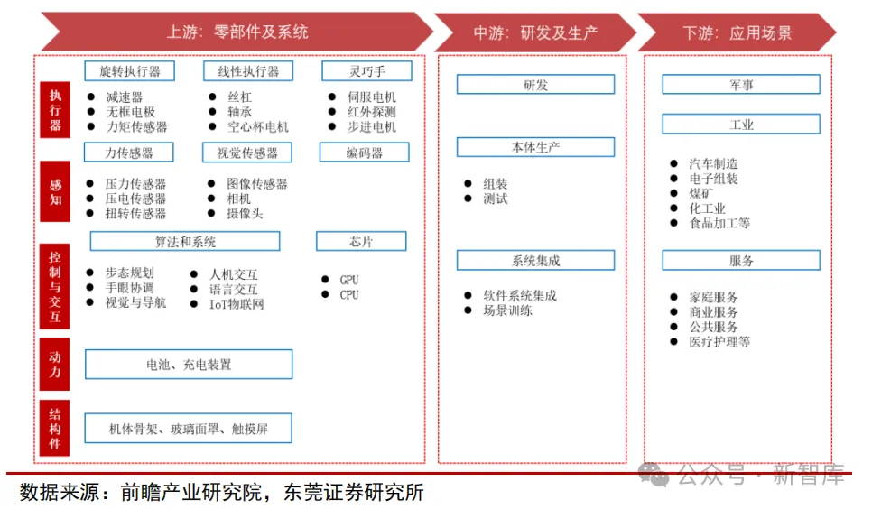 人形机器人产业链可分为上游核心零部件、中游整机制造、下游应用。上游聚焦“大脑” (AI算法、芯片与操作系统)和“小脑”(运动控制)的智能系统,以及"身体"(精密减速器、伺服电机、丝杠等执行器与传感器)的硬件制造;中游主要是产品研发与整机集成。下游应用场景覆盖军事、工业制造(如汽车装配、电子组装等)、服务(家庭服务、商业服务等)等领域。