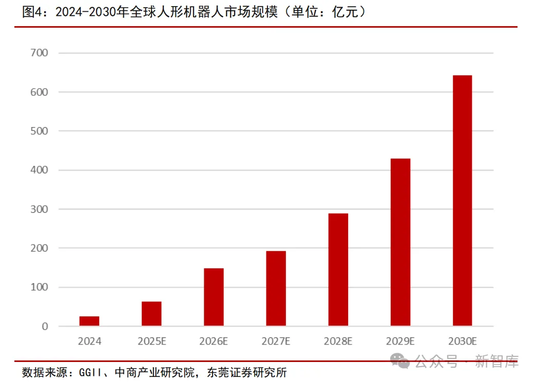 全球人形机器人市场将迎来爆发式增长,根据 GGII 和中商产业研究院的统计,2024 年全球人形机器人市场规模约为 25.62 亿元,预计全球人形机器人市场规模将从 2025 年的约 63.39 亿元增长至 2030 年的 642.22 亿元,年复合增长率达 58.90%。