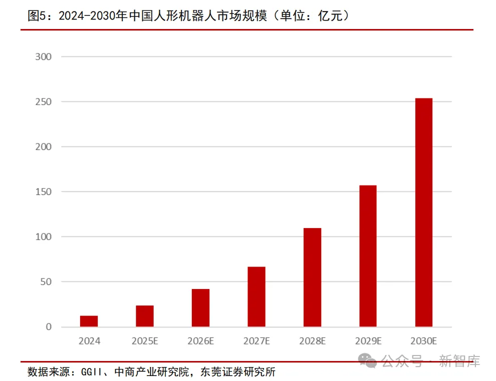 在政策、技术与资本多重利好的驱动下,中国人形机器人市场正处在产业化落地的关键阶段,未来发展可期。根据 GGII 和中商产业研究院的统计,2024 年中国人形机器人市场规模约为 12.54 亿元,预计中国人形机器人市场规模将从 2025 年的约 23.98 亿元增长至 2030 年的 254.04 亿元,年复合增长率达 60.33%。