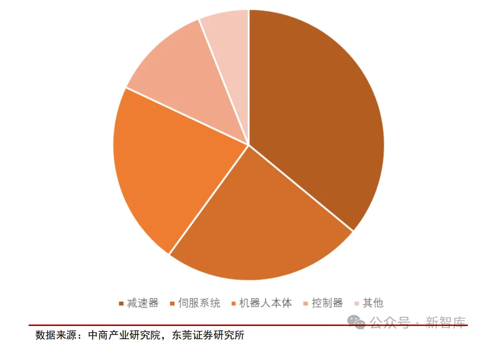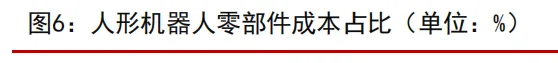 人形机器人零部件成本高度集中于执行与感知系统。人形机器人的成本中,减速器成本占比为 36%,伺服系统成本占比为 24%,机器人本体成本占比为 22%,控制器成本占比为12%。