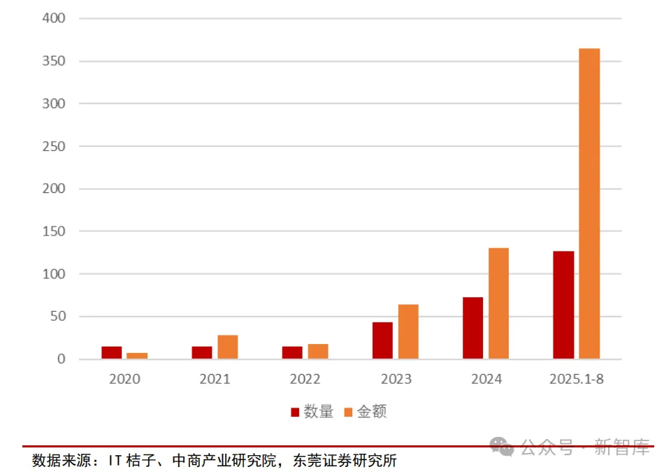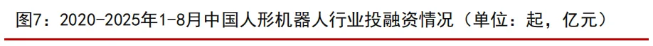 当前,中国人形机器人行业投融资活跃,资本正加速涌入,展现出市场对行业前景的高度认可,有望推动人形机器人的商业化落地和规模化生产。根据 IT 桔子、中商产业研究院统计,2025 年 1-8 月,中国人形机器人赛道披露融资 127 起、金额 364 亿元,已达2024 全年规模的 1.8 倍。