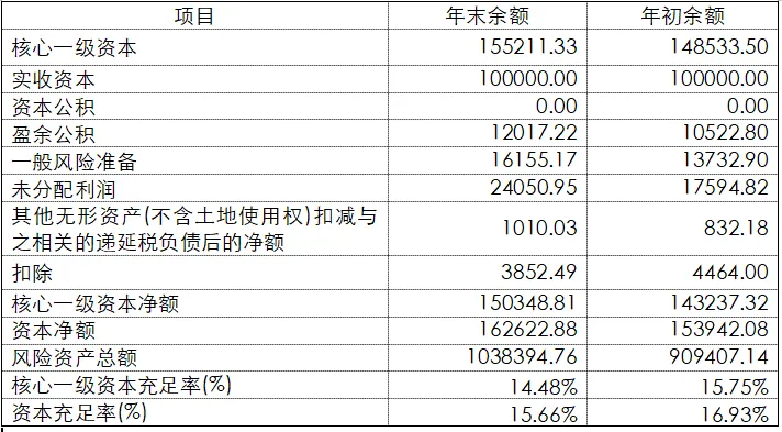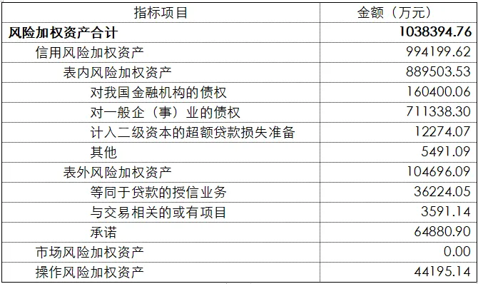 截至2025年12月31日,公司风险加权资产合计1,038,394.76万元,其中信用风险加权资产994,199.62万元,市场风险加权资产0万元,操作风险加权资产44,195.14万元。具体如下表: