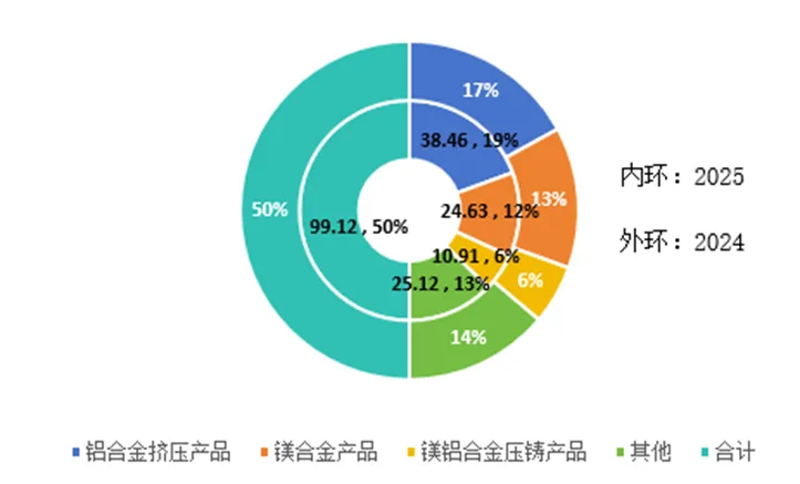 从收入结构来看,镁相关业务是公司的核心支柱之一。2025年,公司镁合金产品实现营业收入24.63亿元,占营业收入的24.84%,同比增长1.57%;镁铝合金压铸产品实现营业收入10.91亿元,占营业收入的11.00%,同比增长7.43%。两项合计,镁业务总收入约为35.54亿元,占公司总营收的比重达到35.84%,相比2024年下降2.44%。