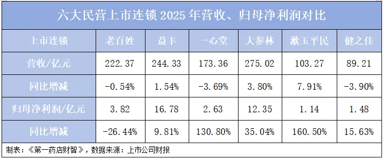 在客流承压、医保监管趋严、价格竞争加剧的2025年,六大上市连锁逐步转向了以效率、毛利和运营质量为核心的稳健经营阶段。从结果看,营收端波动不大,利润端修复更为明显,“降本增利”成为过去一年的共同关键词。