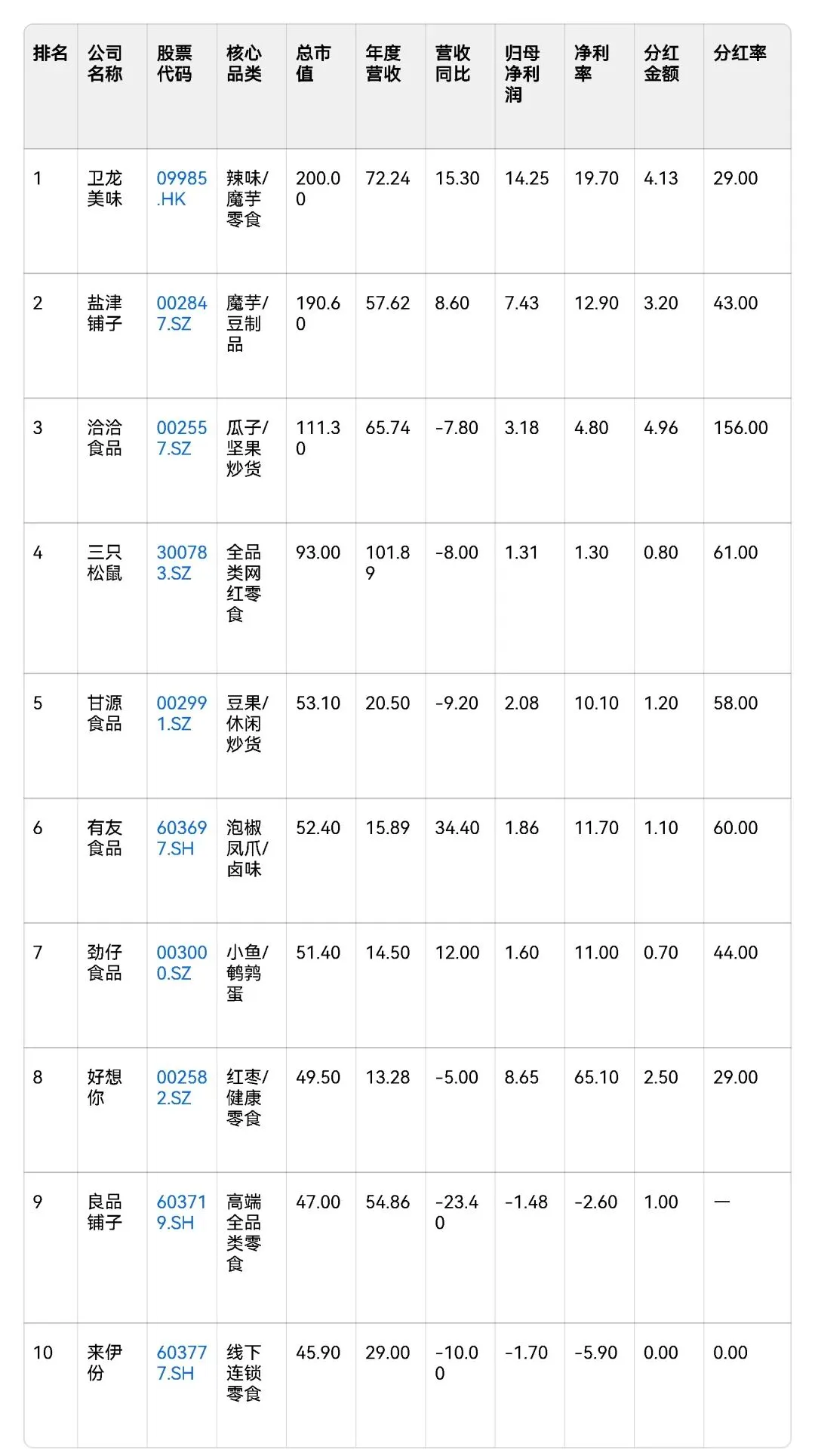 以下为当前市场最具代表性的十家上市零食企业2025年年报核心数据(市值截至2026年4月28日收盘附近):
