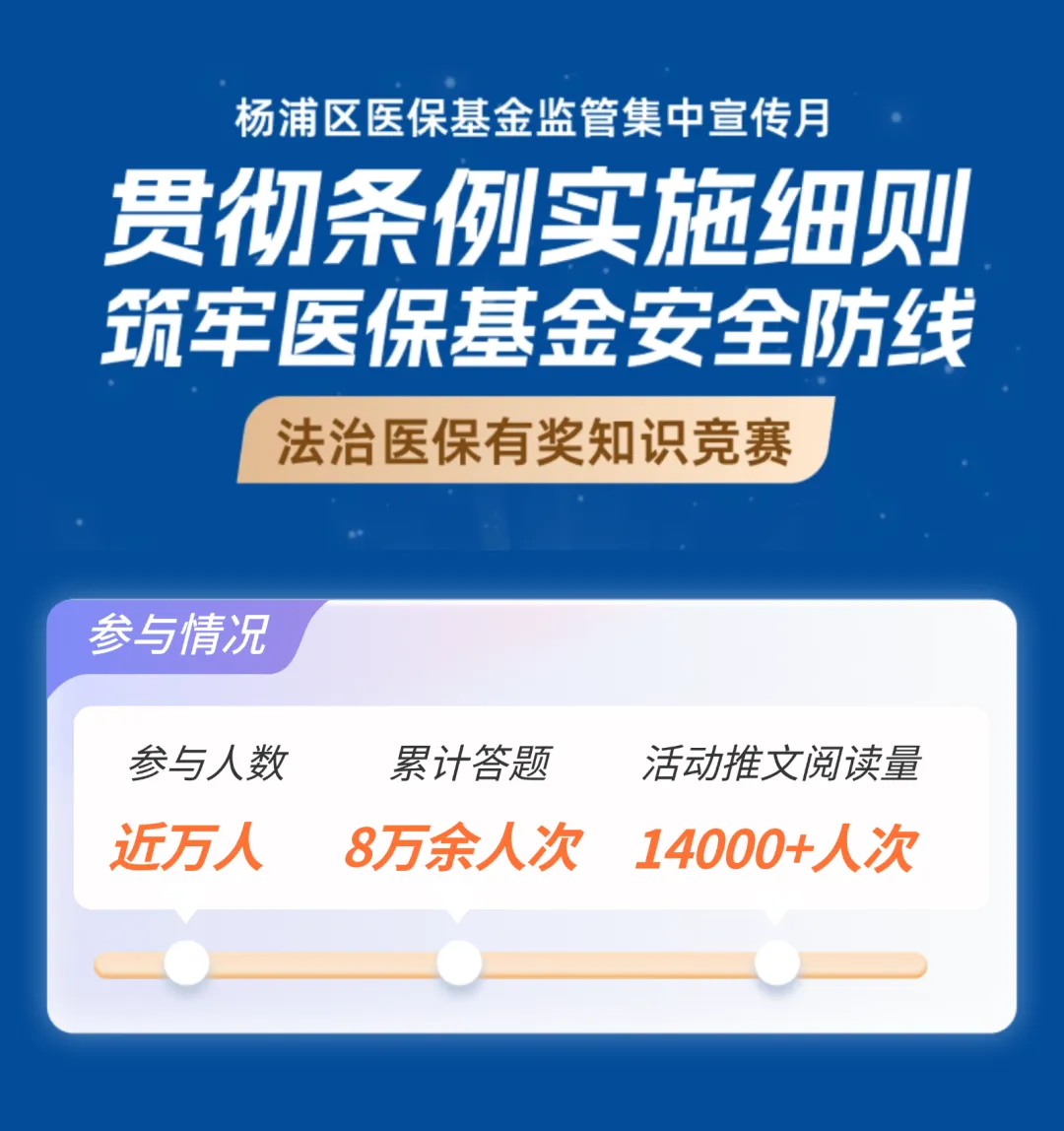 为全面贯彻落实《医疗保障基金使用监督管理条例实施细则》,进一步筑牢医保基金安全防线,在市医保局、区纪委监委指导下,市公安局经侦总队、区公安分局、法院、检察院、民政局、卫生健康委、市场监管局等单位支持下,各定点机构的配合下,杨浦区医保局开展以“贯彻条例实施细则 筑牢医保基金安全防线”为主题的基金监管宣传月活动,线上线下参与及关注人数达9万余人次,营造了全社会共同参与、共同监督、共同守护医保基金安全的浓厚氛围。