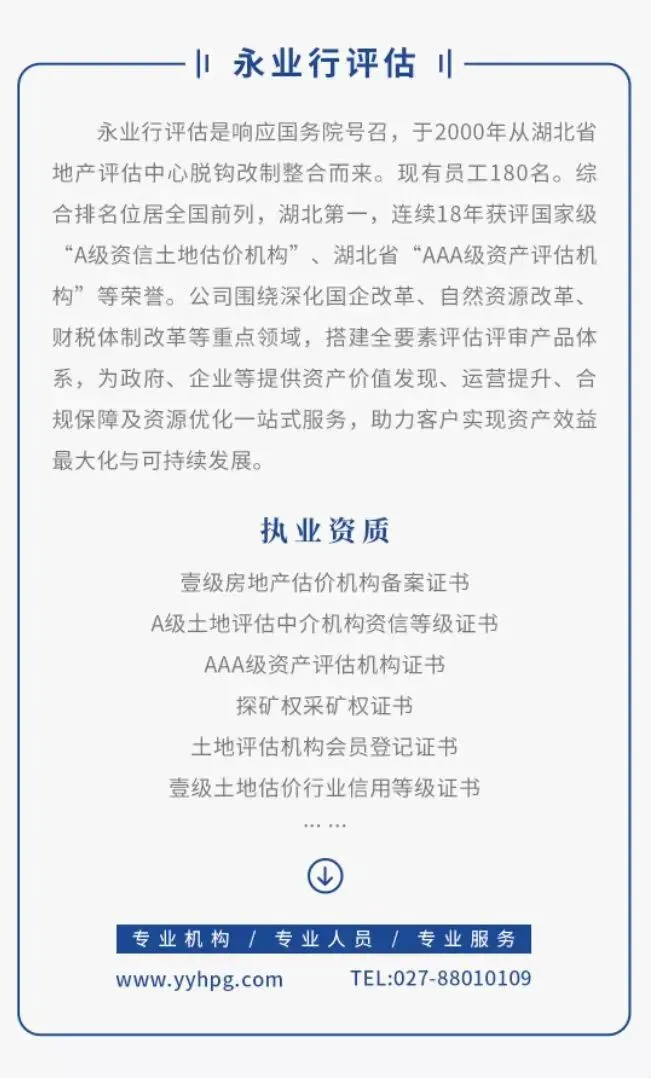 作为国内领先的综合性评估机构,永业行评估公司始终以正确政绩观为引领,立足湖北、服务全国,深度参与国资国企深化改革、行政事业单位转型提质、国有 “三资三变” 改革全流程,以专业价值守护国有资产安全、提升资本效能、助力地方经济高质量发展。