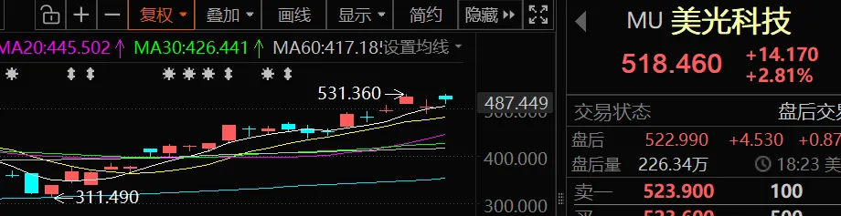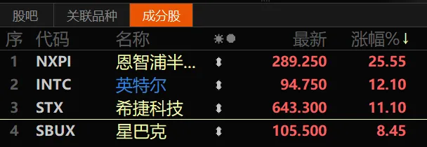 存储板块、苹果概念股、计算机硬件涨幅居前,恩智浦涨超25%,英特尔涨超12%,希捷科技涨超11%,闪迪涨超6%,西部数据涨超5%,高通涨超4%,惠普、美光科技涨超2%。