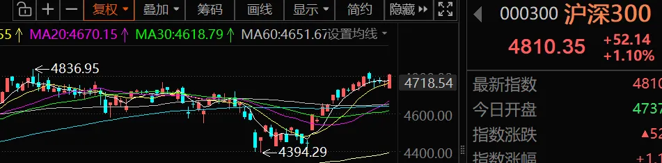 沪深300指数:收出放量阳线。主力资金净流入96.7亿。