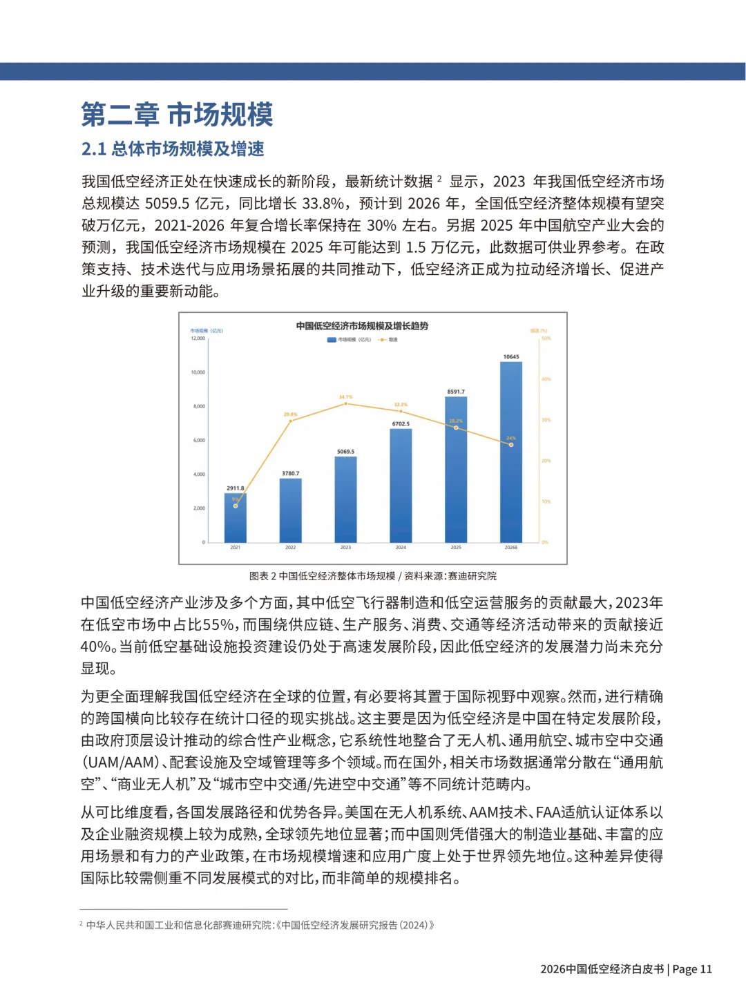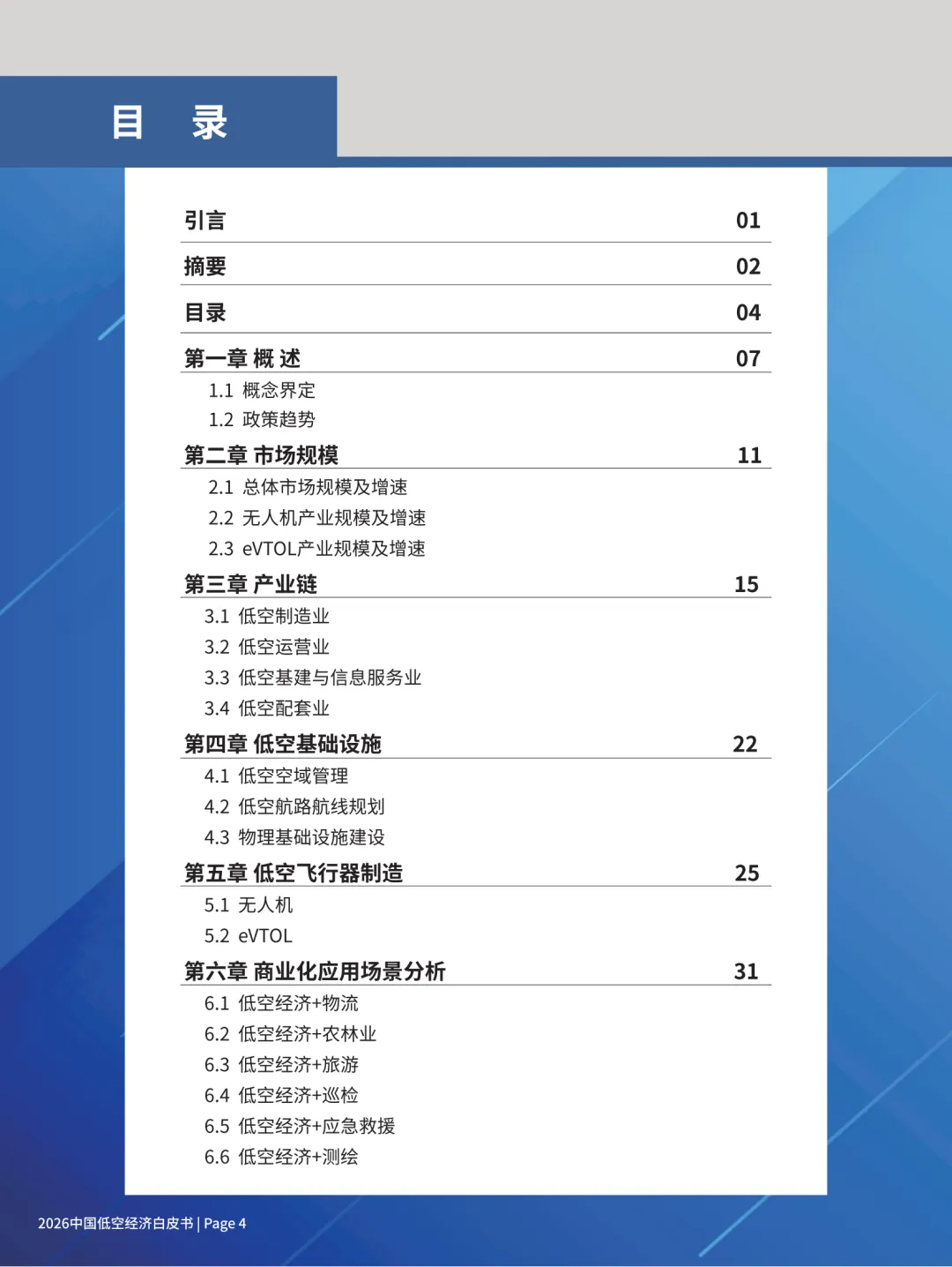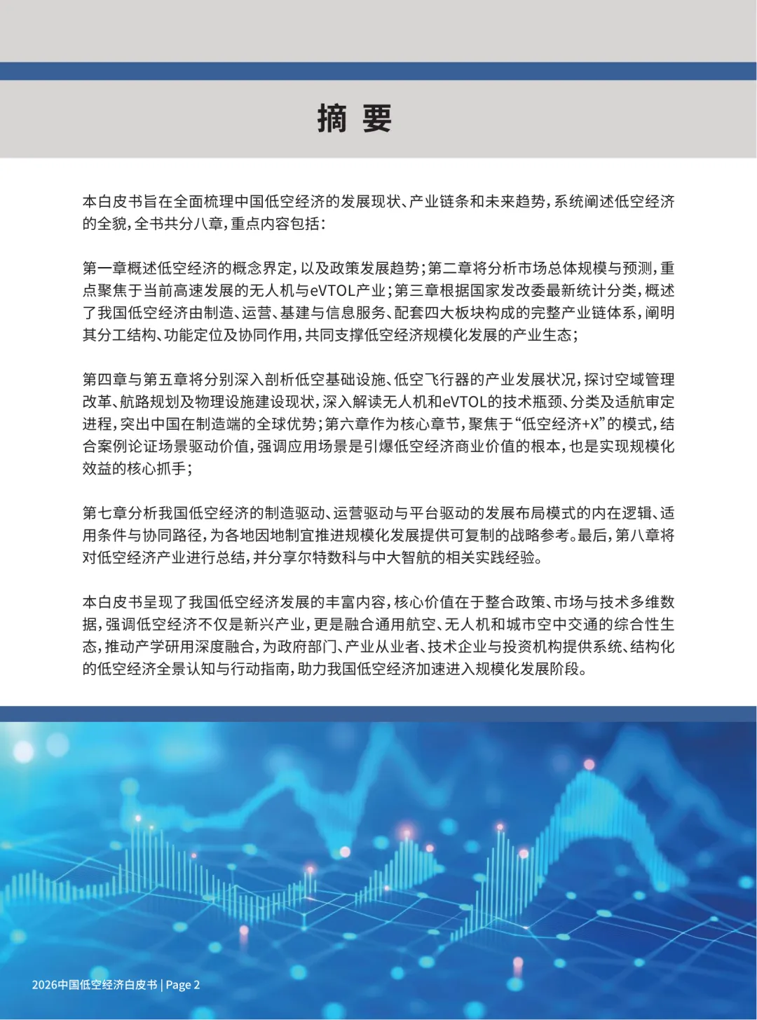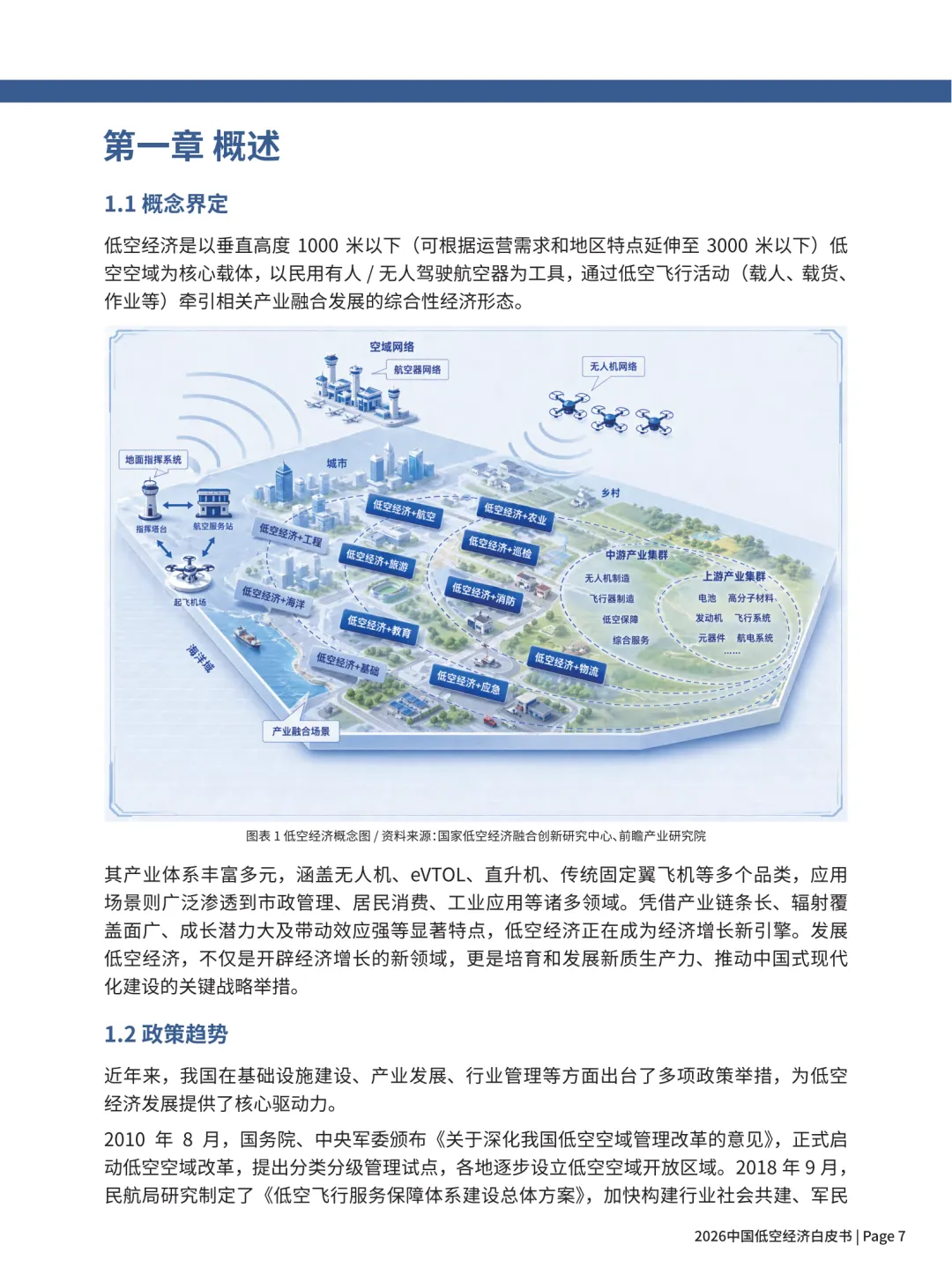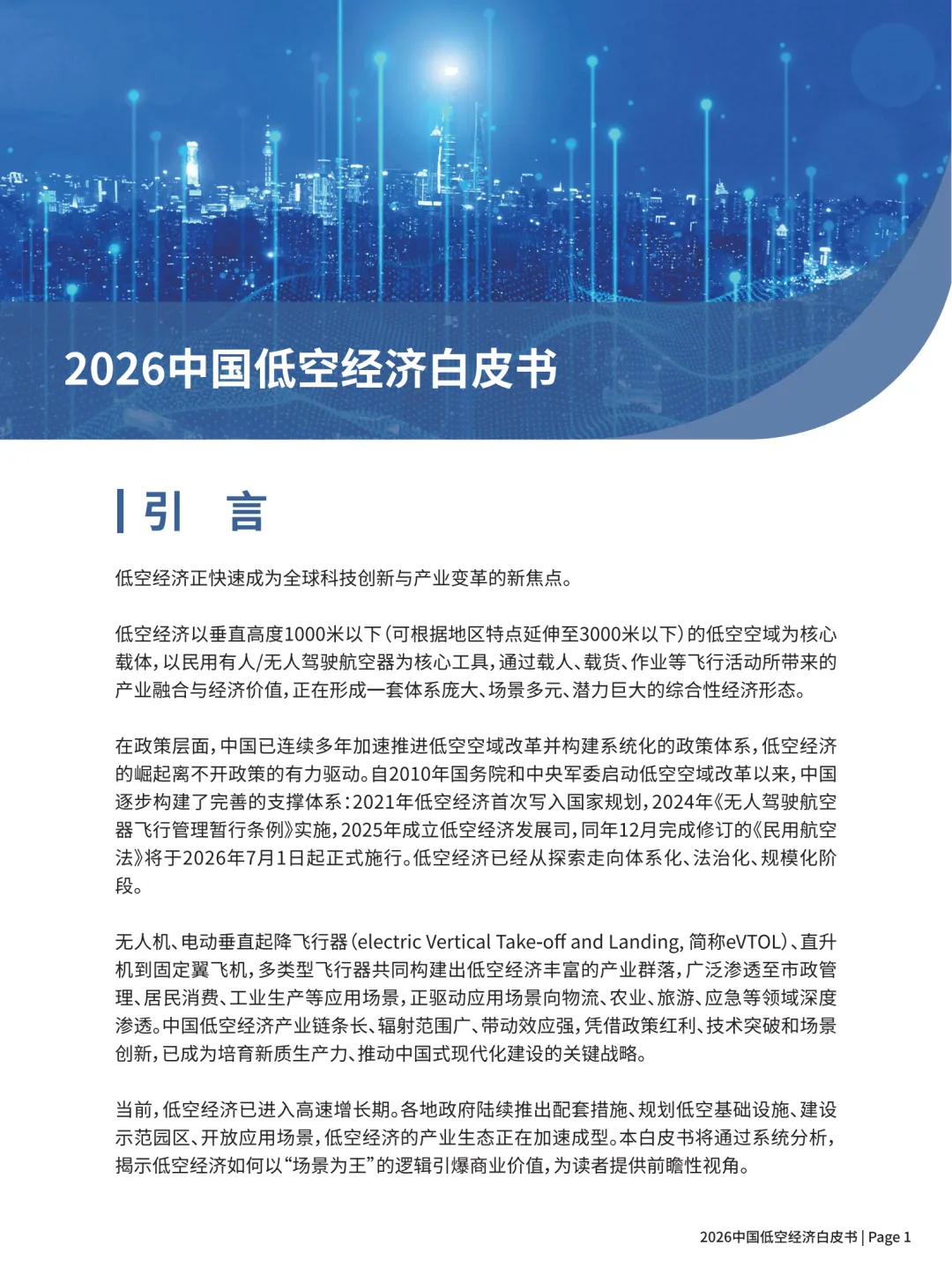 这份《2026 中国低空经济白皮书》核心内容可概括为:中国低空经济已进入政策完善、规模爆发、场景落地的高速发展期,2026 年有望破万亿,以无人机成熟、eVTOL 即将商用为双引擎,形成制造 — 运营 — 基建 — 配套完整产业链,场景为王、模式多元是核心特征。