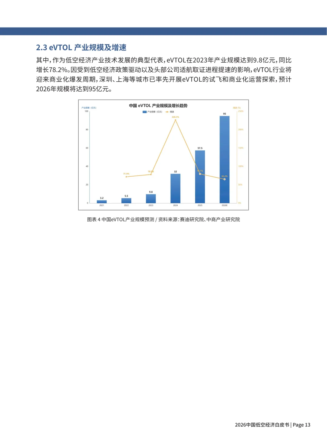 eVTOL:2023 年9.8 亿元(增速 78.2%),2026 年预计 95 亿元,进入商业化爆发期。