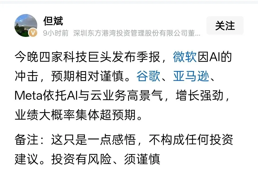 但斌也提到了“微软预期谨慎”、“Meta面临挑战”,说明AI板块短期进入了震荡期。