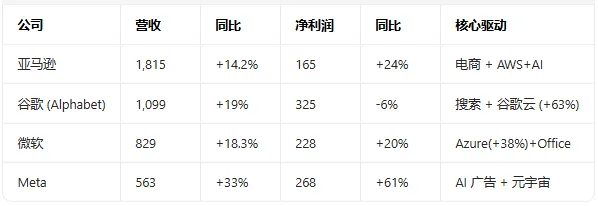 - 谷歌:325 亿,利润唯一同比下滑(-6%),主因 AI 算力投入激增。