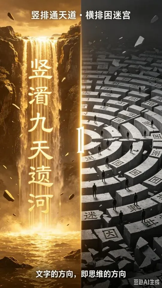 横排之变,正是文王“横易”取代伏羲“滚易”的当代翻版,是二元对立、平面思维、着相逐物的认知范式对通天道统的全面覆盖。而这覆盖的后果,便是今日众生困于横向迷宫、迷失于外驰幻相、忘却归元之路的文化根源。