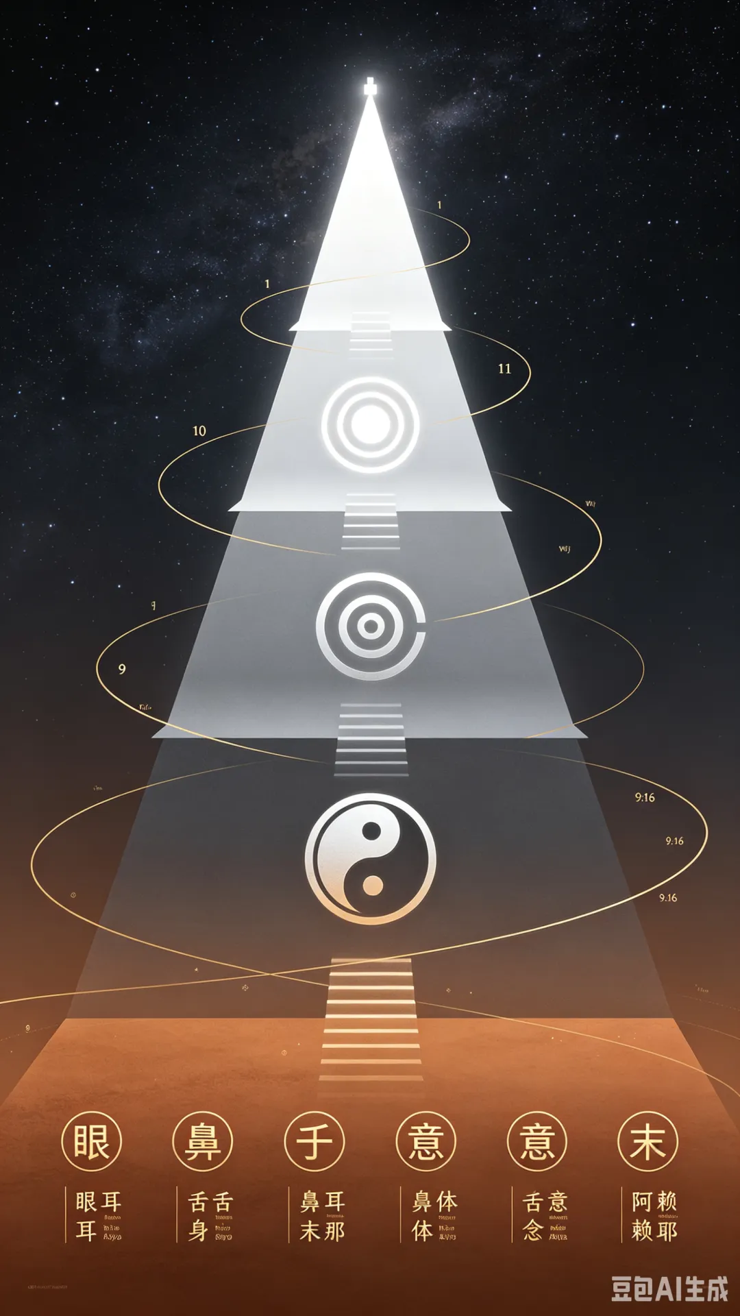 2. 9维:阿赖耶识染污面,以太极图☯表征,阴阳交织、一念无明,是心性染尘、万法缘起、阴阳对立的开端,仍困于诸相表象之中;