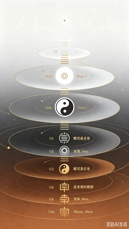 滚排八卦对应八识,为凡尘觉知基础维度,向上升维、向内归元,衔接无极○、太极☯核心法理,成就完整十一维终极闭环,实现从凡尘觉知到宇宙终极本源的彻底贯通: