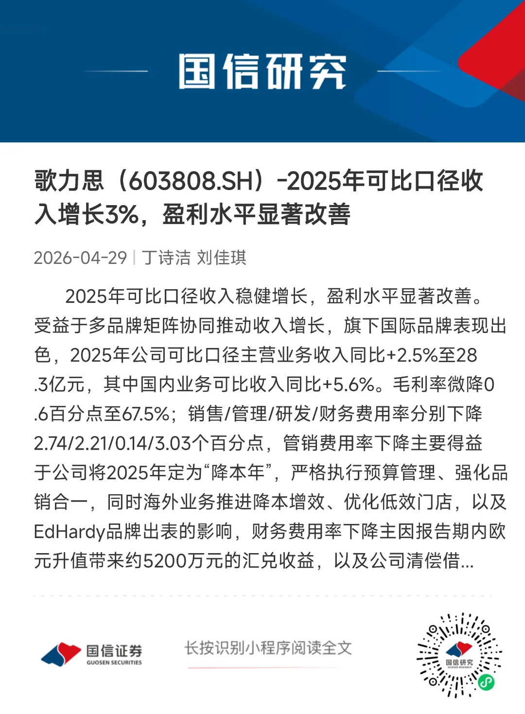 文字节选自报告《国信证券-歌力思(603808.SH)财报点评:2025年可比口径收入增长3%,盈利水平显著改善》,进入小程序查看报告全文