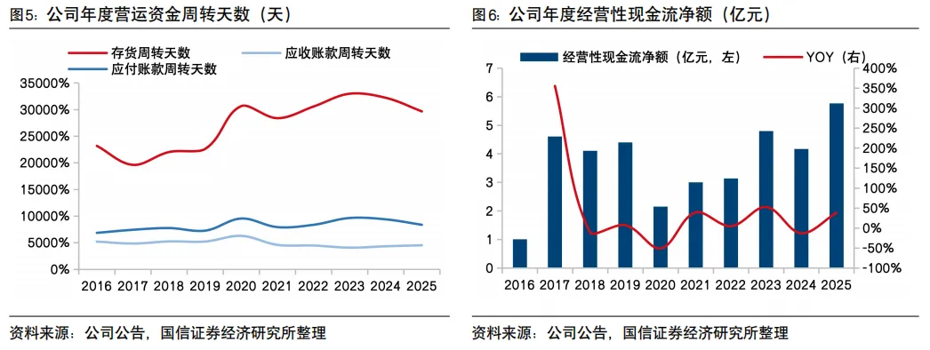 2025年可比口径收入稳健增长,盈利水平显著改善。受益于多品牌矩阵协同推动收入增长,旗下国际品牌表现出色,2025年公司可比口径主营业务收入同比+2.5%至28.3亿元,其中国内业务可比收入同比+5.6%。毛利率微降0.6百分点至67.5%;销售/管理/研发/财务费用率分别下降2.74/2.21/0.14/3.03个百分点,管销费用率下降主要得益于公司将2025年定为“降本年”,严格执行预算管理、强化品销合一,同时海外业务推进降本增效、优化低效门店,以及Ed Hardy品牌出表的影响,财务费用率下降主因报告期内欧元升值带来约5200万元的汇兑收益,以及公司清偿借款后利息支出减少所致。归母净利润扭亏为盈至1.65亿元(去年同期-3.10亿元),主要源于国内业务利润同比实现良好增长,同时海外业务利润同比改善明显,净利率提升至5.8%。此外,公司计提商誉及无形资产减值7799万元,Ed Hardy相关费用及投资收益减少约3800万元,若剔除非经营性因素影响,归母净利润超过2亿元。经营性现金流净额同比+38.2%至5.8亿元,现金流充裕,分红率40.15%。