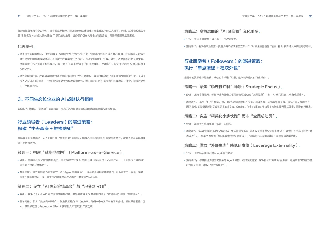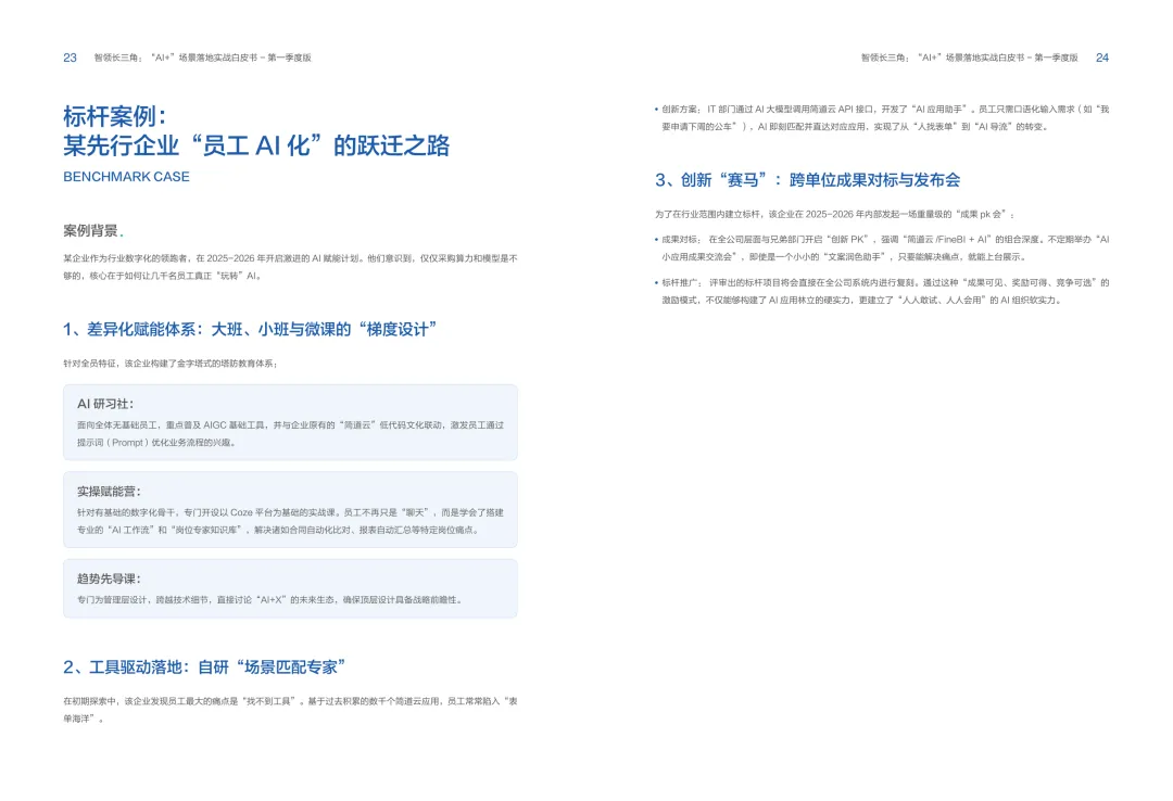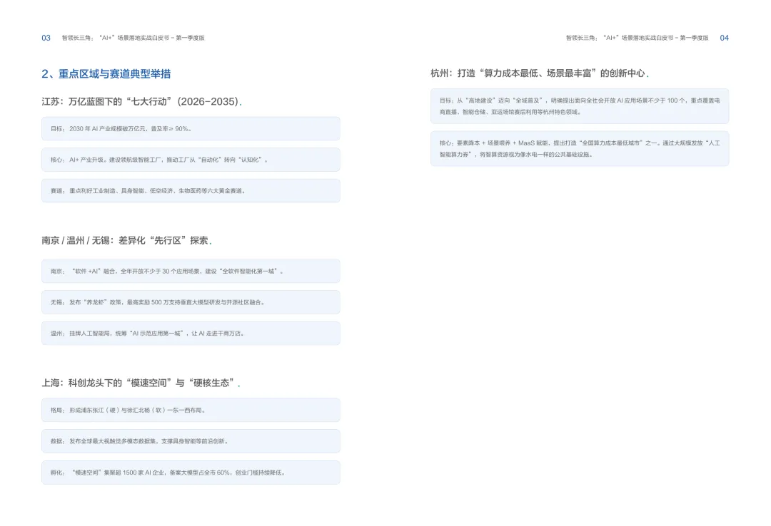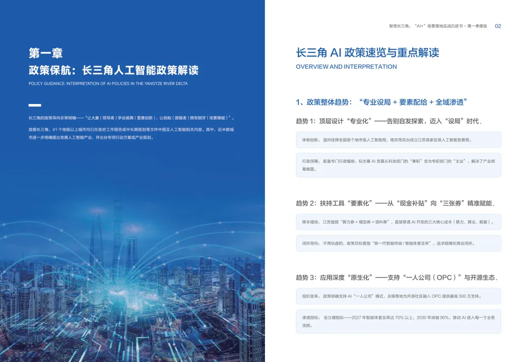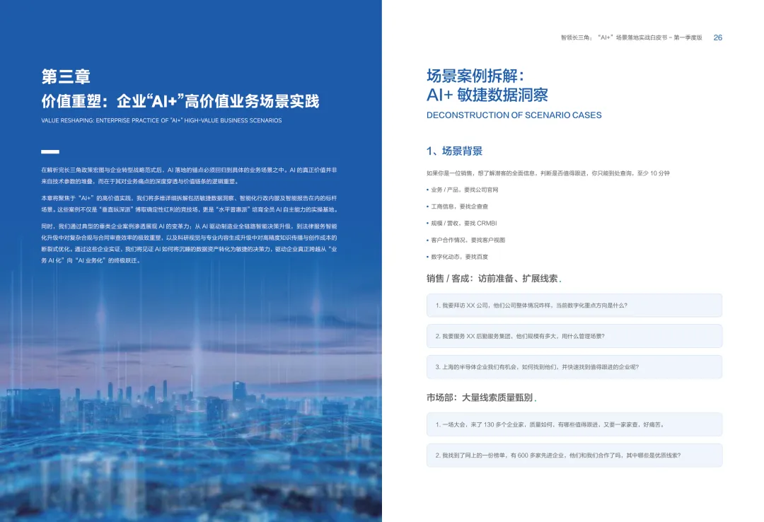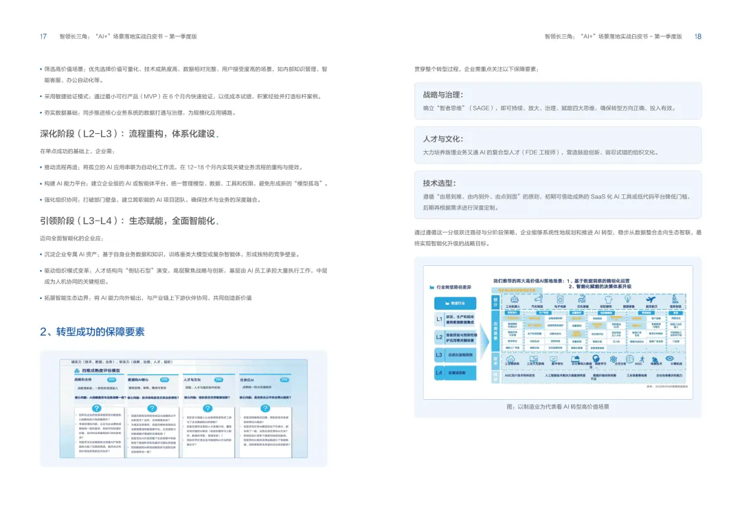 导读:报告聚焦长三角地区 AI 产业发展,系统解读区域人工智能政策。多地设立专职 AI 管理机构,推行算力券、模型券、语料券精准赋能。政策支持 AI 一人公司与开源生态建设,设定智能体普及率硬性目标,推动 AI 与产业深度融合。企业 AI 转型呈现水平普惠与垂直纵深两种核心路径。头部企业搭建全员赋能的 AI 生态,中小主体聚焦高价值场景实现单点突破。报告提出数据自由、场景突破、自主优化、生态智联四级跃迁模型,为企业提供清晰转型路线图。白皮书拆解 AI + 敏捷数据洞察、行政内服、智能报告等高价值场景。AI 技术在制造、法律、科研视觉等领域形成成熟落地方案,有效提升运营效率与决策质量。企业可依托分层赋能、敏捷试点、生态协同等方式,稳步推进 AI 落地,构筑数字化竞争新优势。