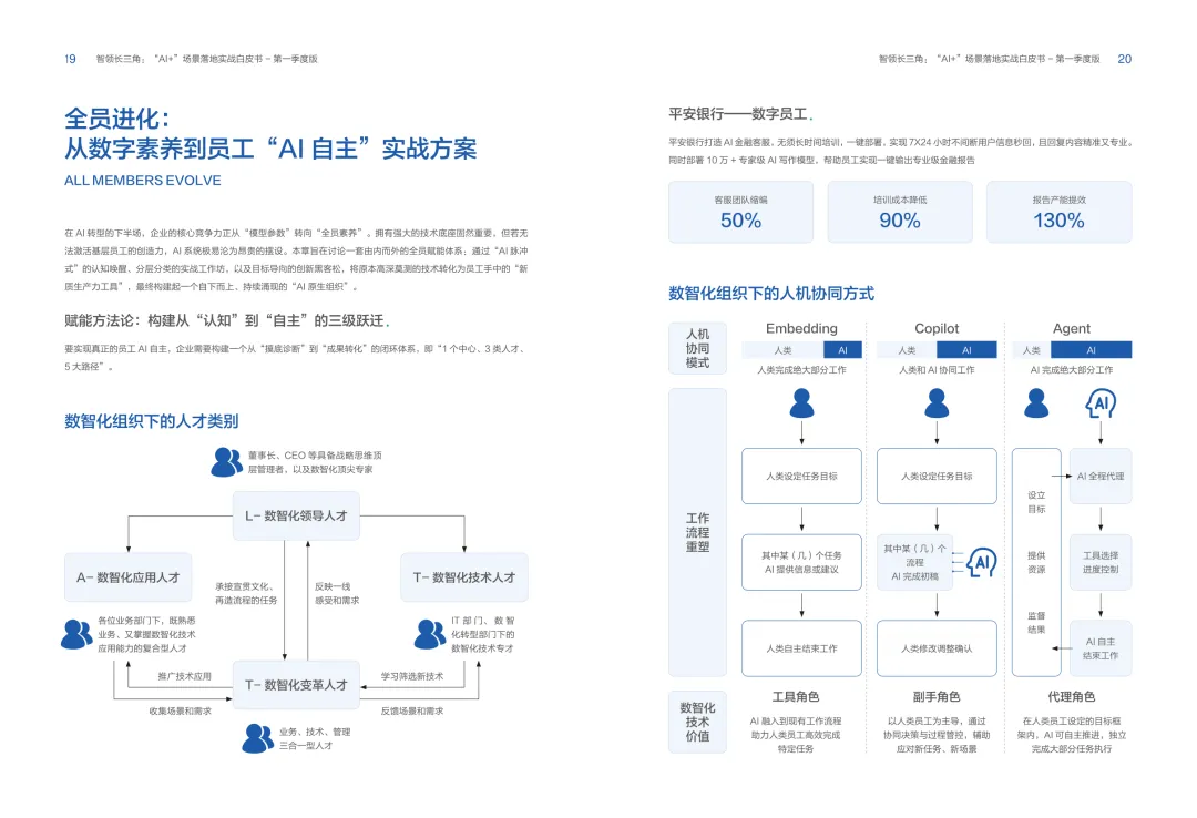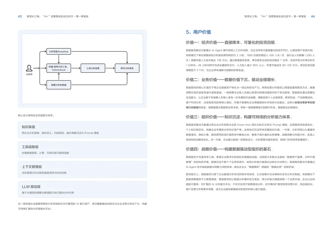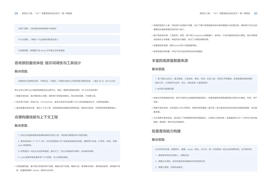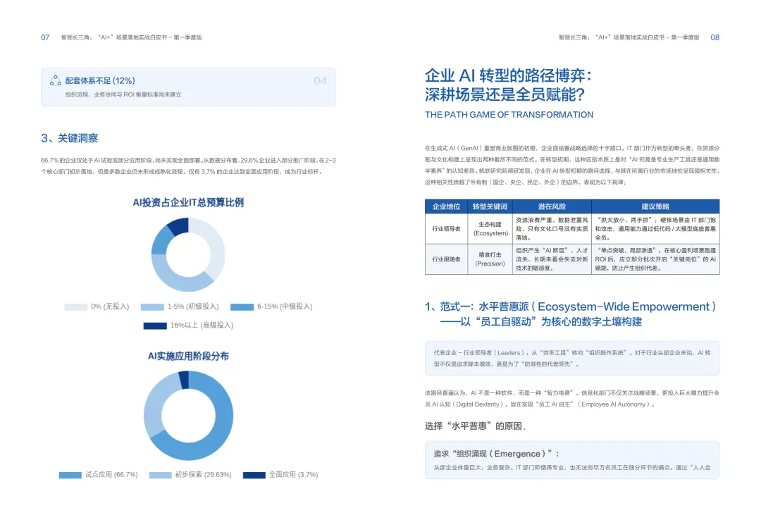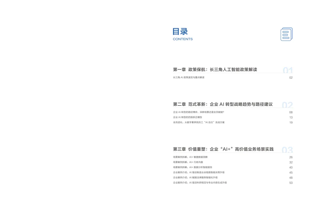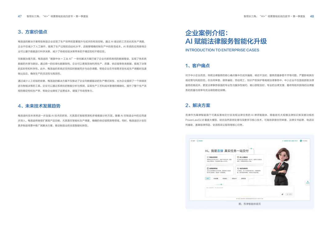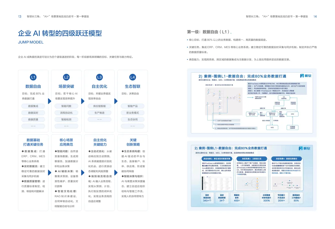 导读:报告聚焦长三角地区 AI 产业发展,系统解读区域人工智能政策。多地设立专职 AI 管理机构,推行算力券、模型券、语料券精准赋能。政策支持 AI 一人公司与开源生态建设,设定智能体普及率硬性目标,推动 AI 与产业深度融合。企业 AI 转型呈现水平普惠与垂直纵深两种核心路径。头部企业搭建全员赋能的 AI 生态,中小主体聚焦高价值场景实现单点突破。报告提出数据自由、场景突破、自主优化、生态智联四级跃迁模型,为企业提供清晰转型路线图。白皮书拆解 AI + 敏捷数据洞察、行政内服、智能报告等高价值场景。AI 技术在制造、法律、科研视觉等领域形成成熟落地方案,有效提升运营效率与决策质量。企业可依托分层赋能、敏捷试点、生态协同等方式,稳步推进 AI 落地,构筑数字化竞争新优势。