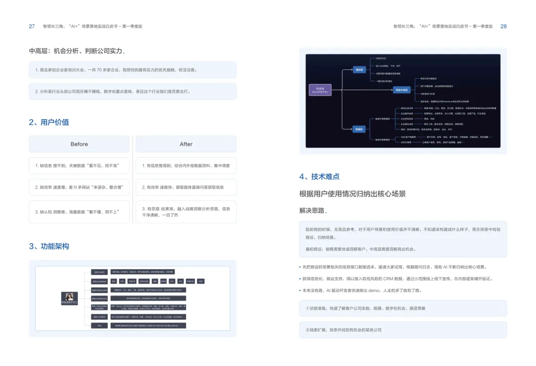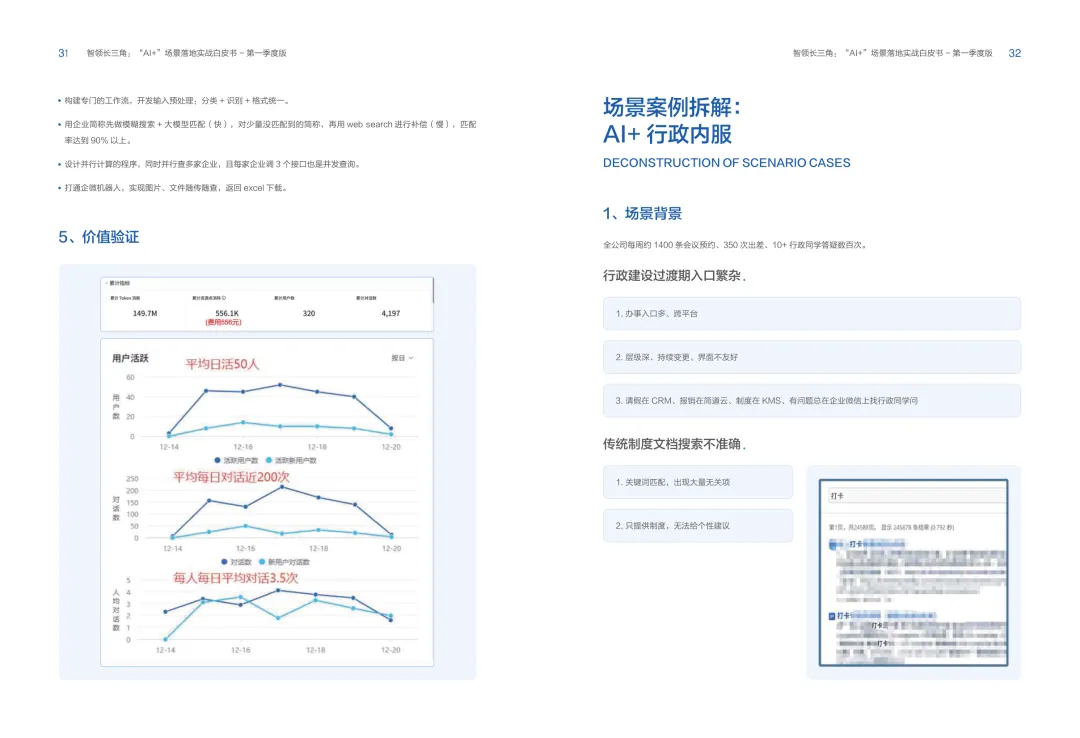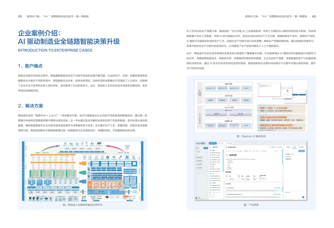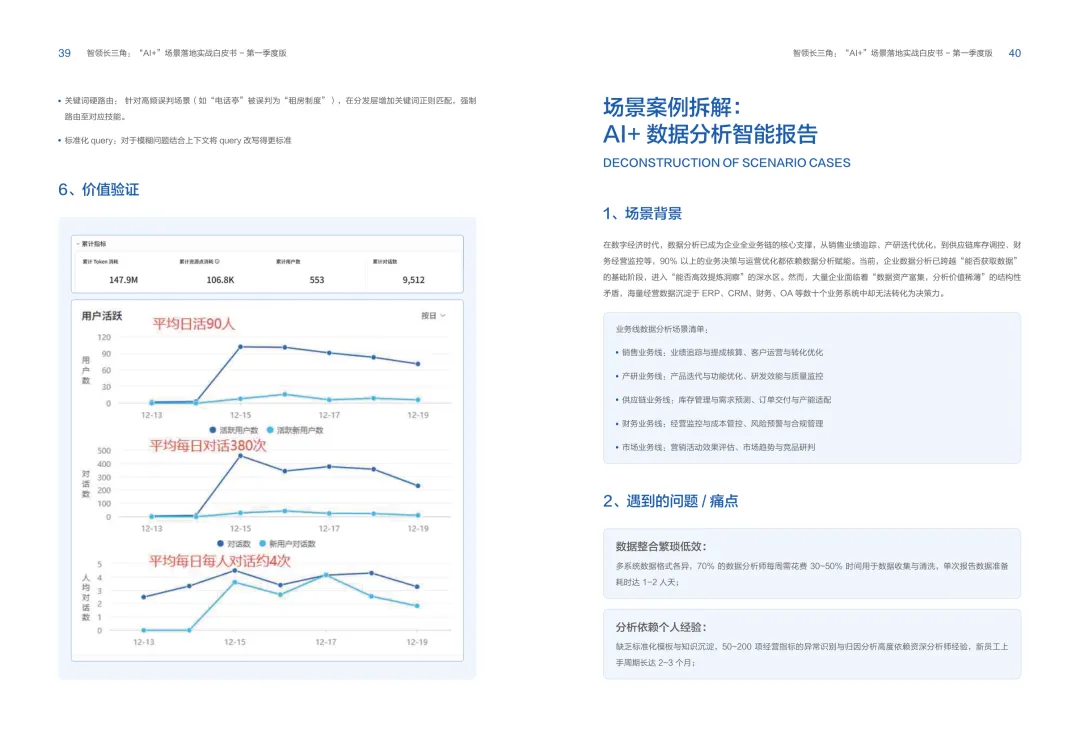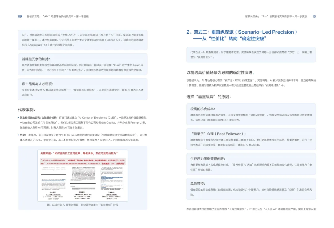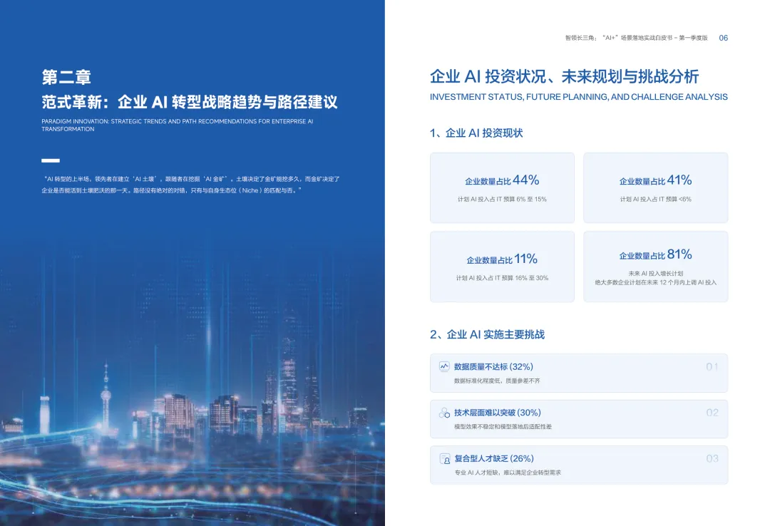 导读:报告聚焦长三角地区 AI 产业发展,系统解读区域人工智能政策。多地设立专职 AI 管理机构,推行算力券、模型券、语料券精准赋能。政策支持 AI 一人公司与开源生态建设,设定智能体普及率硬性目标,推动 AI 与产业深度融合。企业 AI 转型呈现水平普惠与垂直纵深两种核心路径。头部企业搭建全员赋能的 AI 生态,中小主体聚焦高价值场景实现单点突破。报告提出数据自由、场景突破、自主优化、生态智联四级跃迁模型,为企业提供清晰转型路线图。白皮书拆解 AI + 敏捷数据洞察、行政内服、智能报告等高价值场景。AI 技术在制造、法律、科研视觉等领域形成成熟落地方案,有效提升运营效率与决策质量。企业可依托分层赋能、敏捷试点、生态协同等方式,稳步推进 AI 落地,构筑数字化竞争新优势。