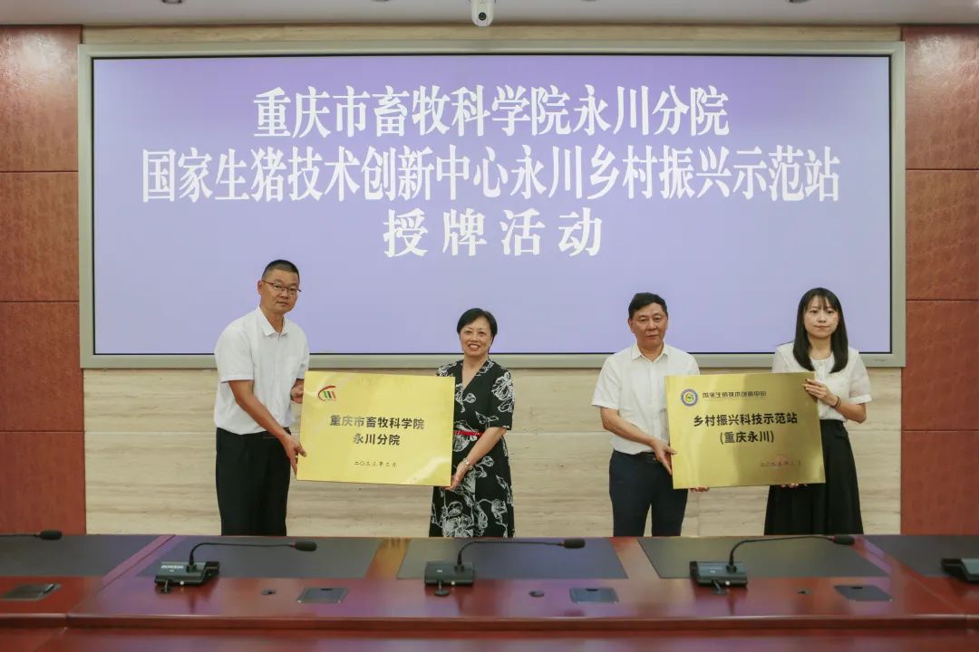 在与会领导的见证下,任伯平副区长为“重庆市畜牧科学院永川分院”授牌,永川分院院长丁玉春接牌;黄勇副院长为“国家生猪技术创新中心永川乡村振兴示范站”授牌,永川乡村振兴科技示范站站长杨晞鳐接牌。