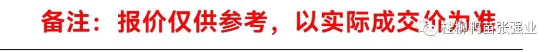 徐桂2.3;金晶2.35;粤桂1.6,麻鸭2.9,白番4.2;南宁桂柳1.6,麻鸭2.9,半番4.6;桂隆1.6,大种麻鸭3.8;江西桂柳1.8,麻鸭2.9,半番4.6;川桂1.8;惠州桂柳1.6,麻鸭2.9,半番4.6;种蛋1.7。
