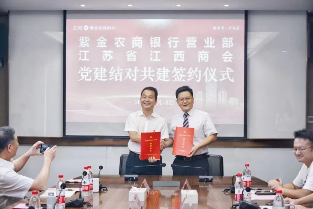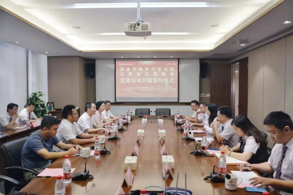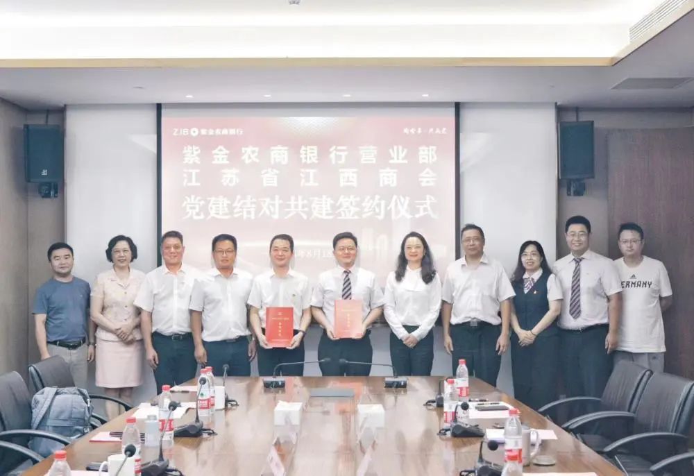 下午,江苏省江西商会党支部书记、常务副会长廖列站,监事长袁晓明,秘书长危海鹰,常务副会长黄国海,副会长黄洪青、党支部组织委员胡越等一行,又前往紫金农商银行总行开展银企座谈交流并签订党建结对共建协议。总行党委委员、副行长徐燕,总行营业部党委书记、总经理李晓宇,公司金融部副总经理罗利军等共同与会。
