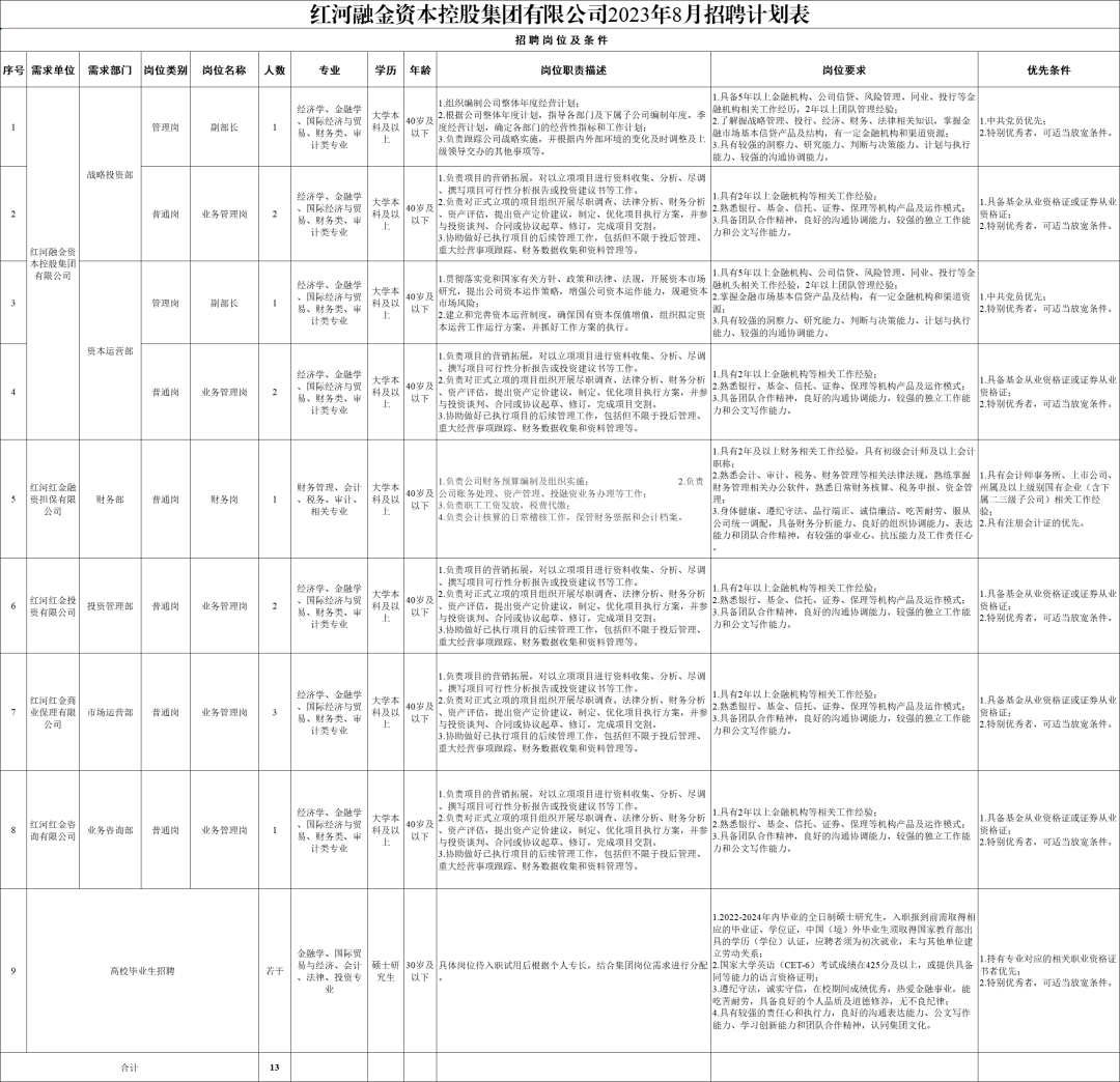 《红河融金资本控股集团有限公司2023年8月公开招聘计划表》 (附件1)