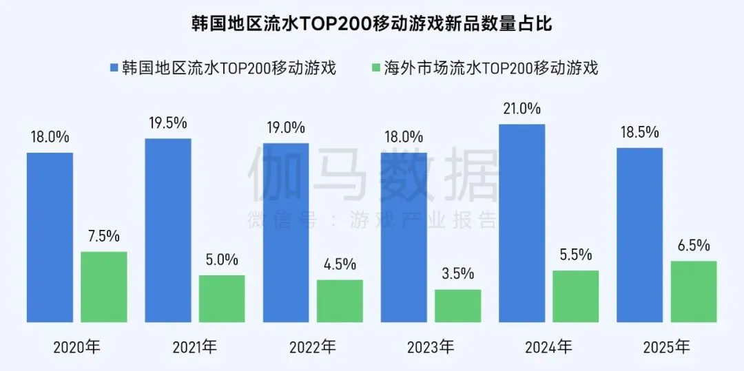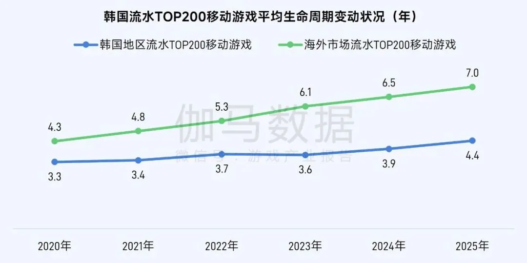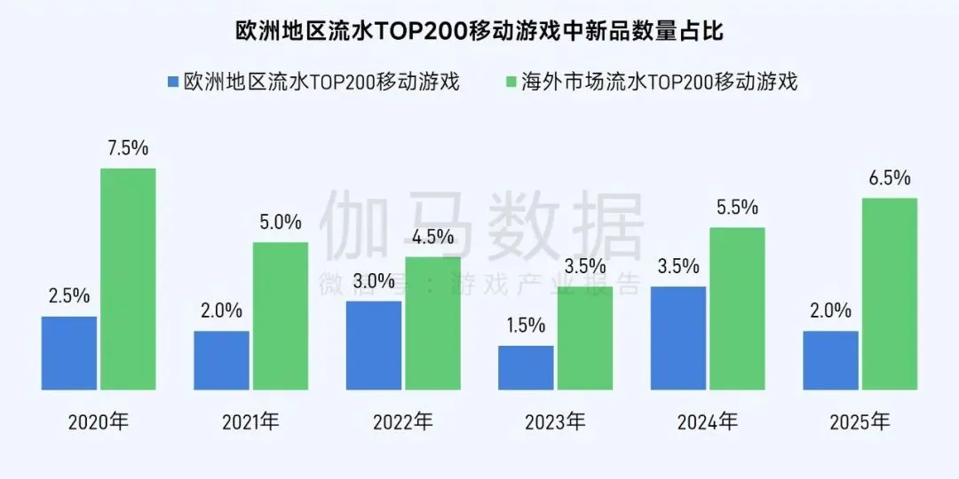 2020—2025年,在海外市场流水TOP200移动游戏中,新品占比长期处于5%左右的低位区间,2025年小幅回升至6.0%。六年间,头部榜单始终由老牌产品占据主导,海外移动游戏市场格局呈现高度固化态势,新品突围难度持续加大。出海企业依托新品快速打入市场头部的路径愈发受限,核心课题已逐步转向如何持续提升长线运营能力,以有效延长成熟产品的生命周期。同时,市场固化并非意味着新品全无机会,精准把握市场定位,凭借差异化产品力打开缺口,仍有望实现突破。