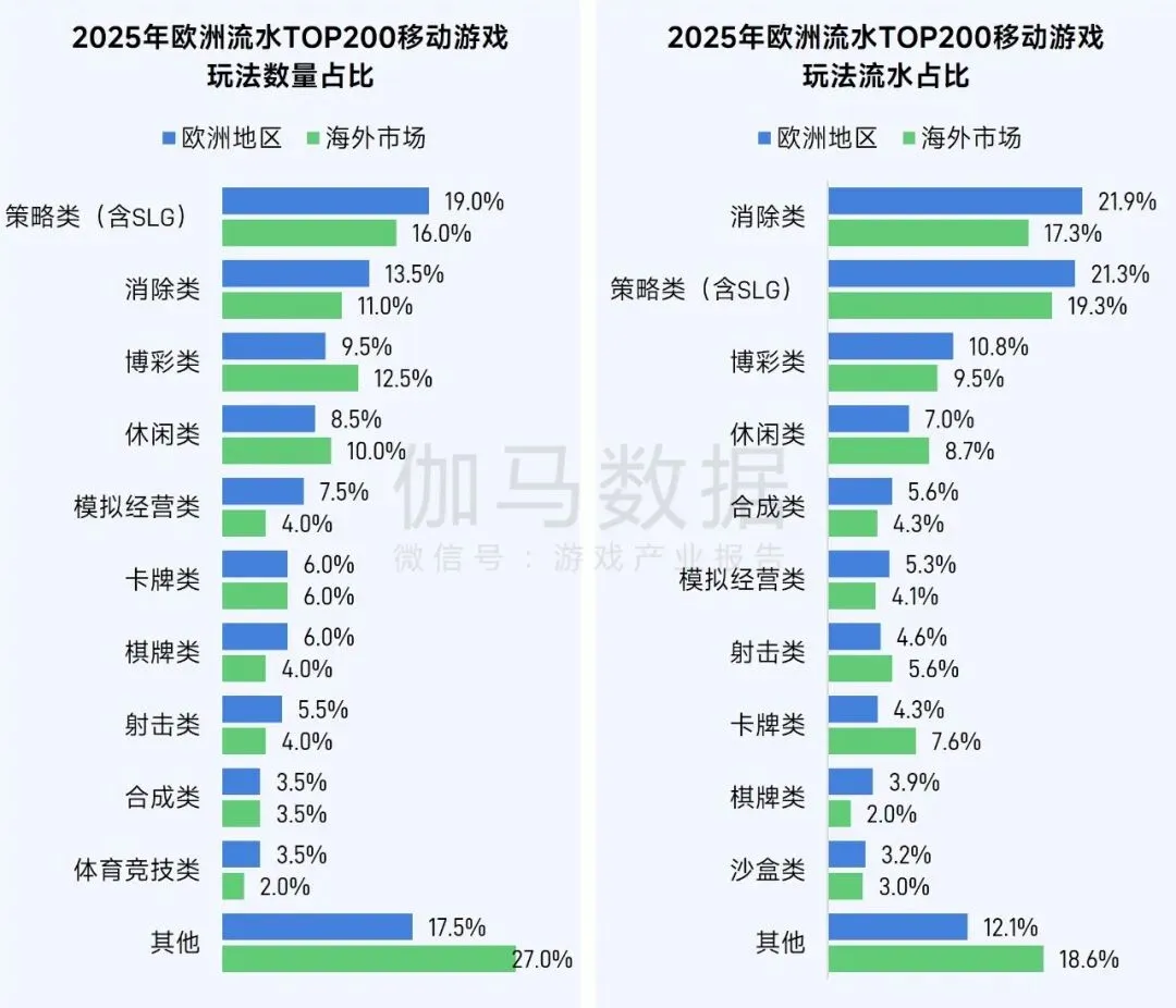 2025年,欧洲整体移动游戏市场规模达人民币761亿元,同比增长9.8%,以欧元计价增速为4.8%,整体延续增长态势。但主要增量由长线运营产品支撑,新品供给相对有限。欧洲用户偏好消除、策略、博彩、休闲等品类,消除类与休闲类游戏内容更新难度较小,能迅速匹配用户需求,博彩产品甚至不需要依赖游戏内容层面的更新,而SLG用户对于内容的消耗速度较慢,用户品类偏好特点决定了新品难突围。
